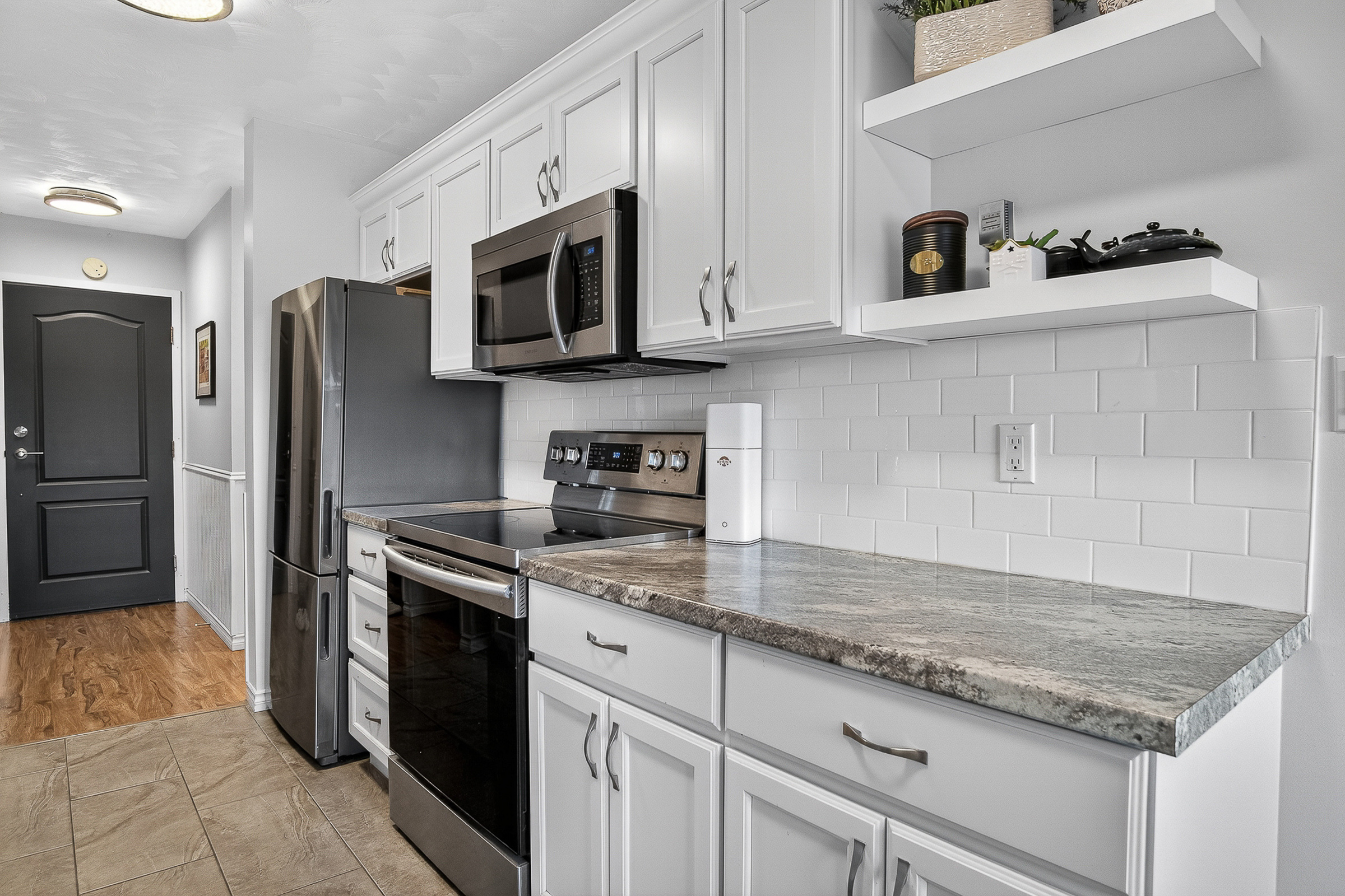 Perched high on the 12th floor in one of Saint John’s most sought-after neighbourhoods, this beautifully updated condo in Millidgeville offers a lifestyle that blends comfort, convenience, and breathtaking views. Overlooking the river and rolling hills beyond, the ever-changing vistas create a peaceful backdrop you’ll enjoy every day. The balcony offers added privacy with a divider on one side, while the opposite side borders the elevator bank, limiting exposure and enhancing the sense of seclusion. Thoughtfully designed, the 800 sq. ft. layout feels bright, open, and surprisingly spacious. The updated kitchen stretches longer than expected, featuring crisp white subway tile, sleek low-profile stainless steel appliances, and a clean, modern aesthetic. The bathroom renovation is equally impressive, with a tiled walk-in shower and glass door, complemented by elegant, tasteful lighting throughout the home. Located just steps from the elevator, this unit offers everyday ease within Brentwood Towers. This building is known as a pillar of the community and a safe, secure investment. Residents enjoy an indoor pool, laundry facilities, a little free library, interior mailboxes, common area, assigned parking, and 24-hour on-site management. The $541/month condo fee includes heat, lights, hot water, and parking, adding exceptional value. Bright, private, and move-in ready, this is an incredible opportunity in a prime location. Preferred closing is the first week of May.