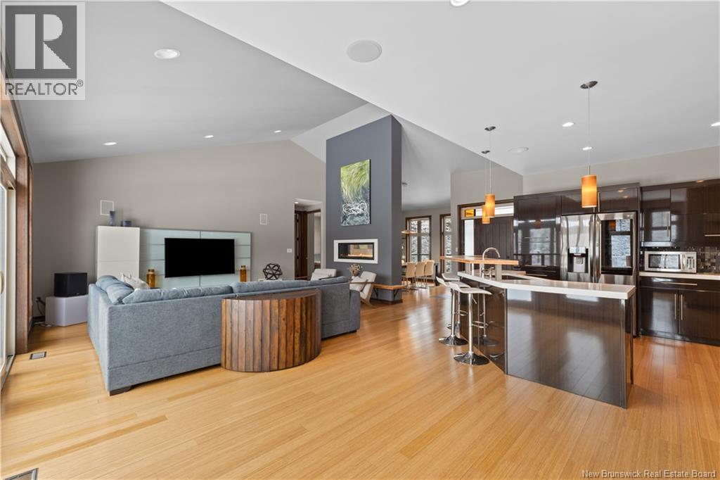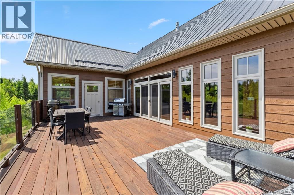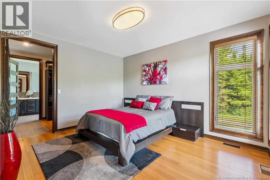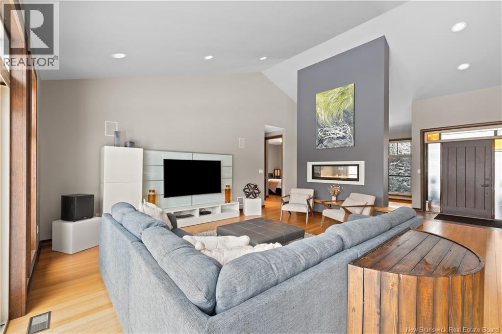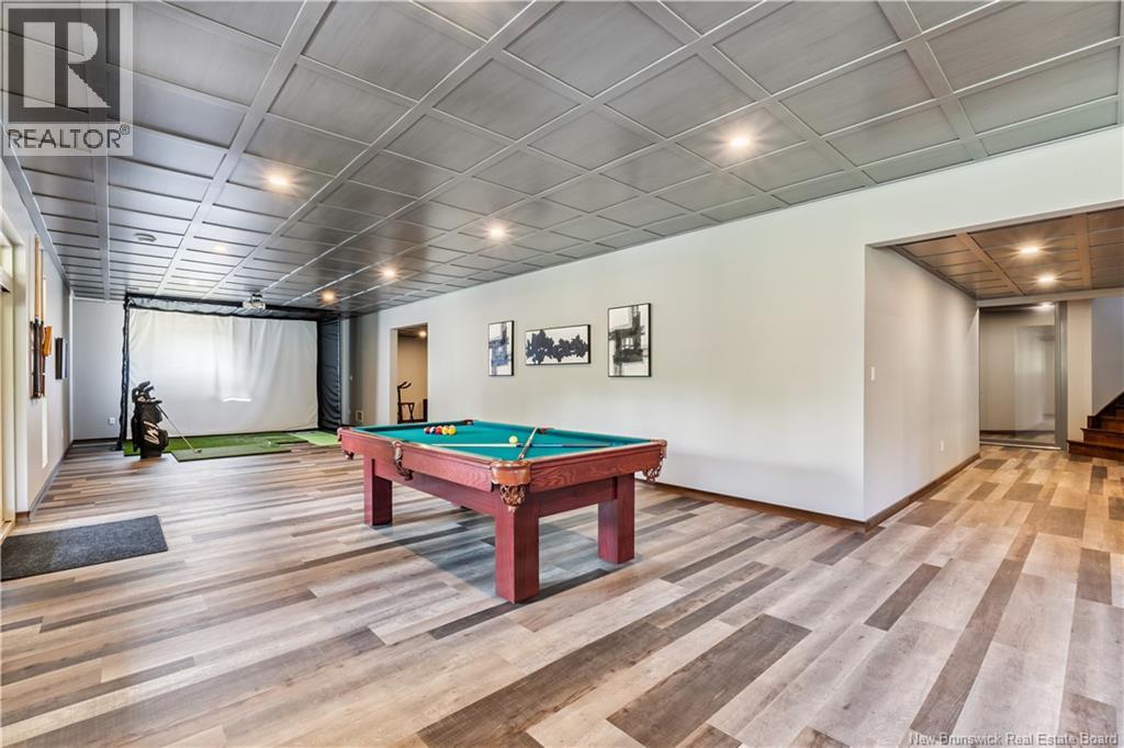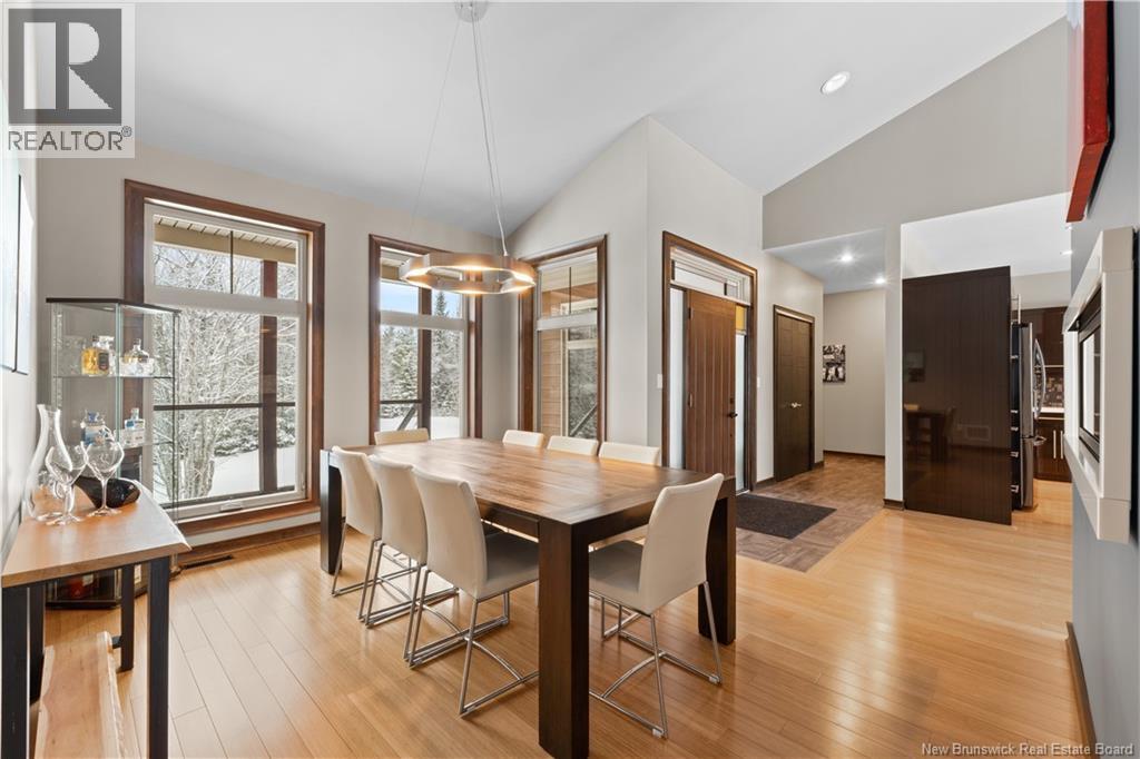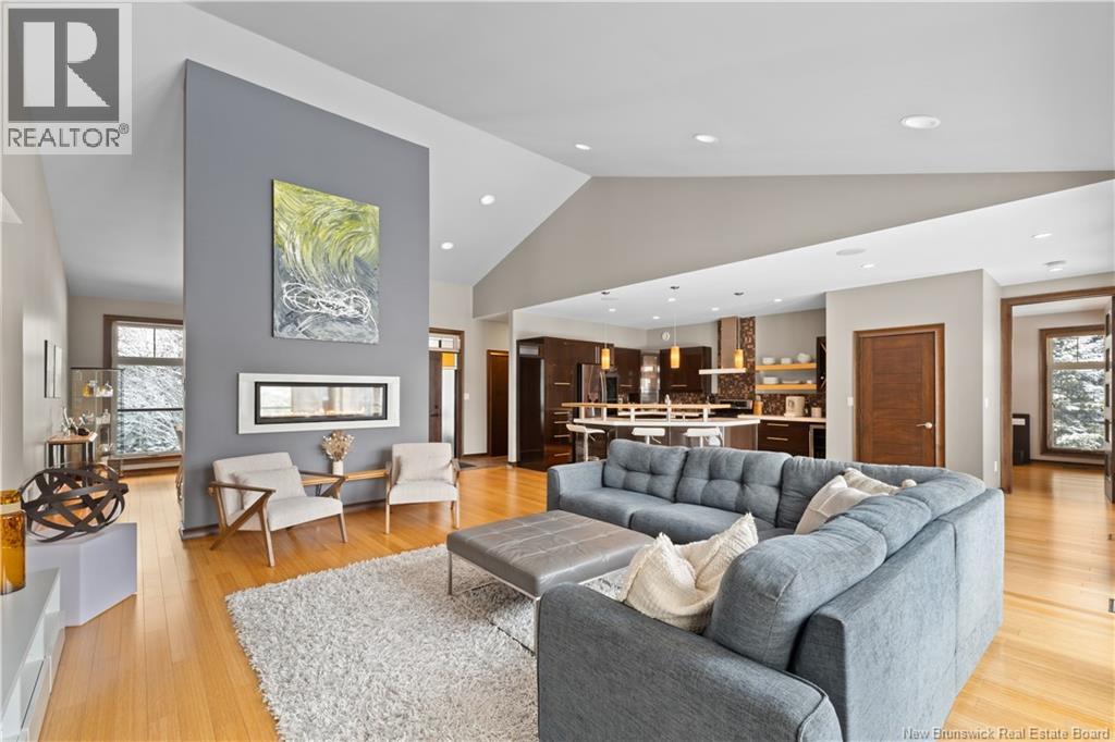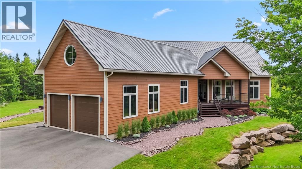Freshly painted PRIVATE EXECUTIVE RETREAT on a private 2.59 ACRE LOT, minutes from Dieppe and Moncton. This architecturally striking bungalow with LOFT offers nearly 3,900 sq ft of finished living space designed for PRIVACY, space, and long-term COMFORT without sacrificing convenience. The main level features soaring ceilings, dramatic feature walls, and an open-concept layout anchored by a DUAL-SIDED PROPANE FIREPLACE. Large windows flood the home with natural light while framing views of the surrounding trees. The chefs kitchen includes a large island, upgraded fixtures, and seamless flow to the dining and living areas, ideal for entertaining or everyday living. FOUR BEDROOMS are located on the MAIN LEVEL, including a spacious PRIMARY SUITE with spa-inspired ENSUITE and WALK-IN-CLOSET. A second full bathroom, main-floor laundry, and mudroom add everyday functionality. The LOFT above offers flexible space for a home office or quiet retreat. The fully finished WALK-OUT BASEMENT features a professional GOLF SIMULATOR, games and LOUNGE AREAS, custom WINE CELAR, GYM, and direct access to the lower patio and HOT TUB area. Outdoor living includes an elevated deck, fire pit area, and mature trees creating a rare sense of seclusion. Additional highlights include GEOTHERMAL heating and cooling, METAL ROOF, DOUBLE attached GARAGE. A rare incredible offering combining estate-style privacy with city convenience. (id:34572)