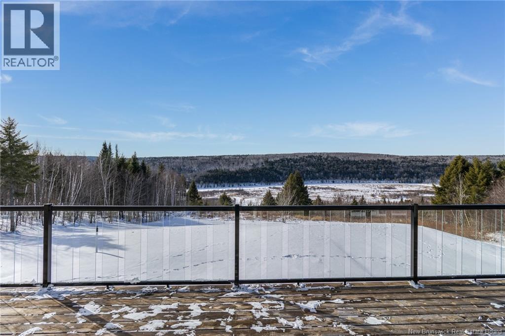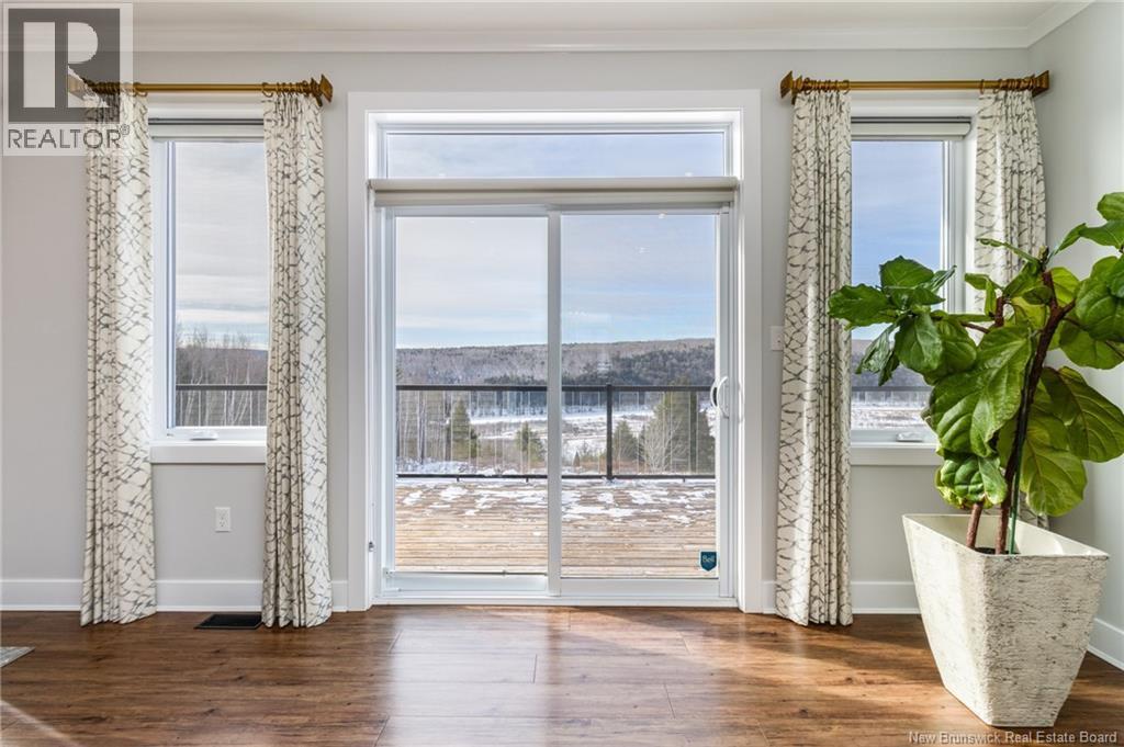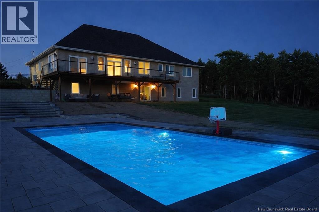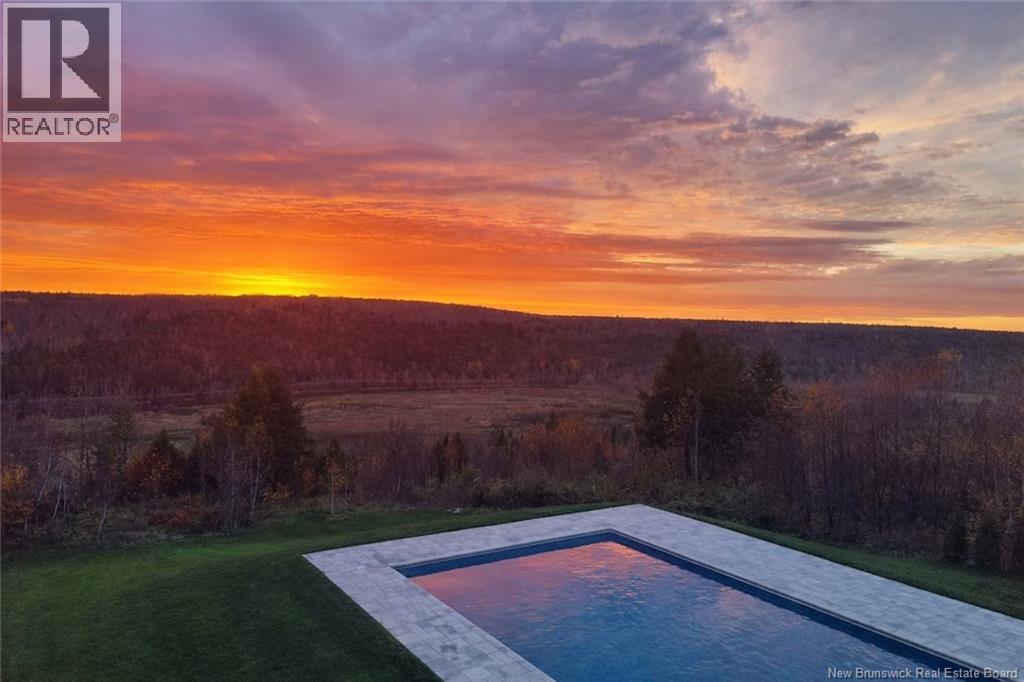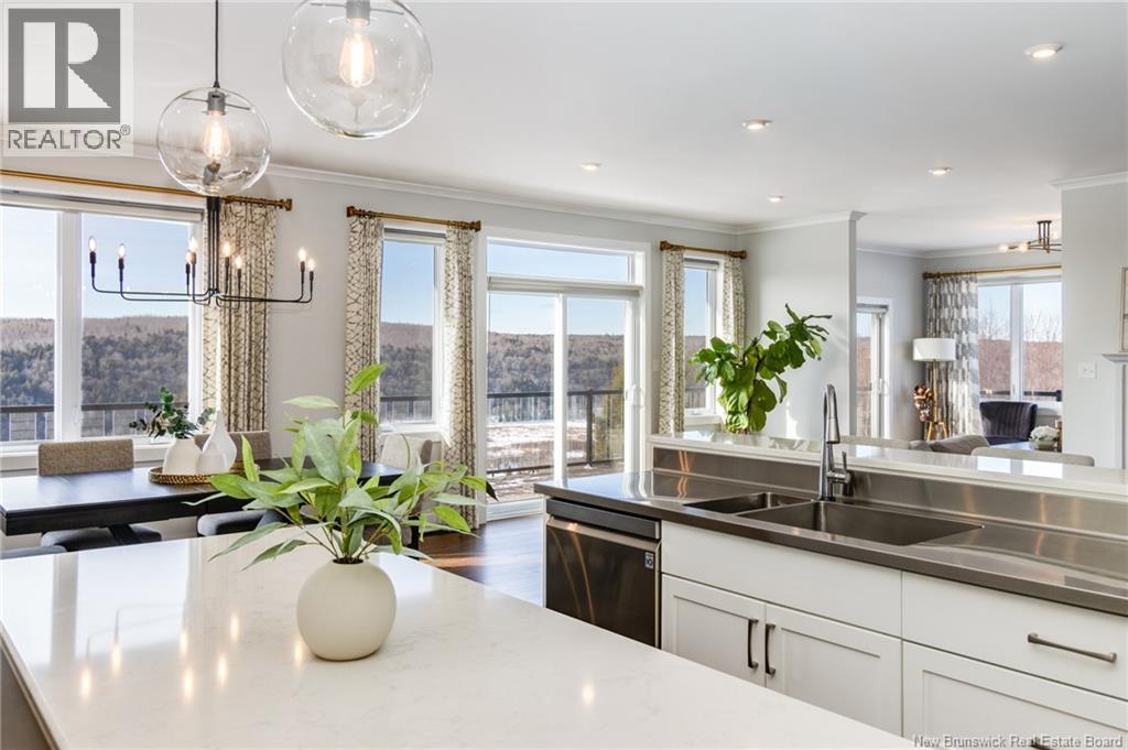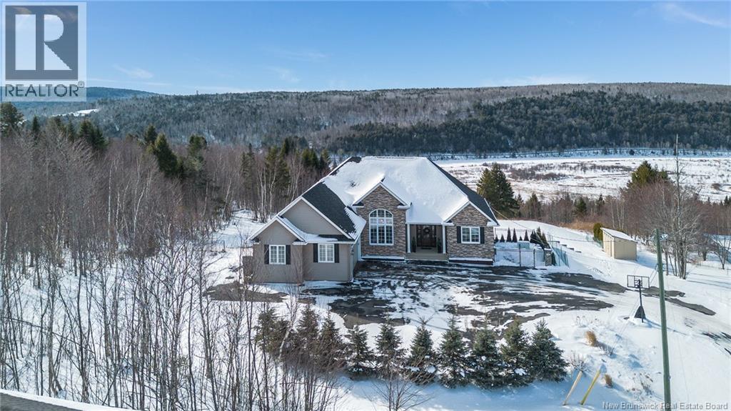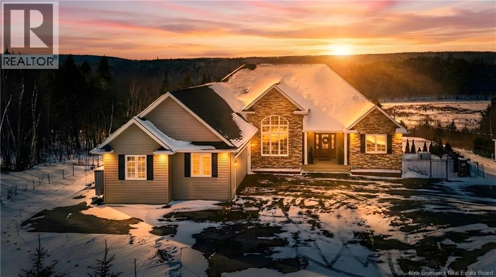 Nestled along the Nashwaak, this luxurious residence offers sweeping vistas of New Brunswicks beautiful landscape. The main floor features 9-foot ceilings, a modern white kitchen, a central island, and a bright dining area overlooking the view. The open living room includes a fireplace as its focal point, leading to a versatile bonus room with stunning views. The main office at the front of the house features a striking 14-foot cathedral ceiling and a large display window. The guest bedroom, with its own bathroom, is located on one wing, while the master suite occupies the opposite wing, offering a walk-in closet and ensuite bath. A formal mudroom off the garage and convenient laundry round out the main level. Downstairs, theres a spacious family room with walk-out access to the yard, a bar area, two bedrooms, a third full bathroom, and plenty of clean storage space. Furthermore, a fully integrated propane backup generator ensures continuous and reliable power supply without interruption. The two-acre property is distinguished by its meticulously maintained landscaping, interlock stone pathways, a retaining wall, and an intentionally designed garden. Numerous blue spruce and emerald cedar trees have been planted to enhance privacy. Additionally, the NB trail is situated at the rear of the property. The heated in-ground saltwater pool offers great views and includes an electric cover, making this property a genuine oasis (id:34572)