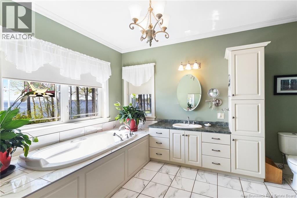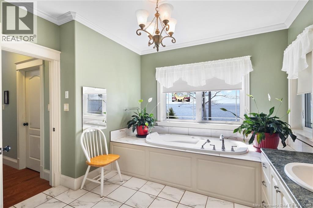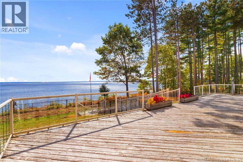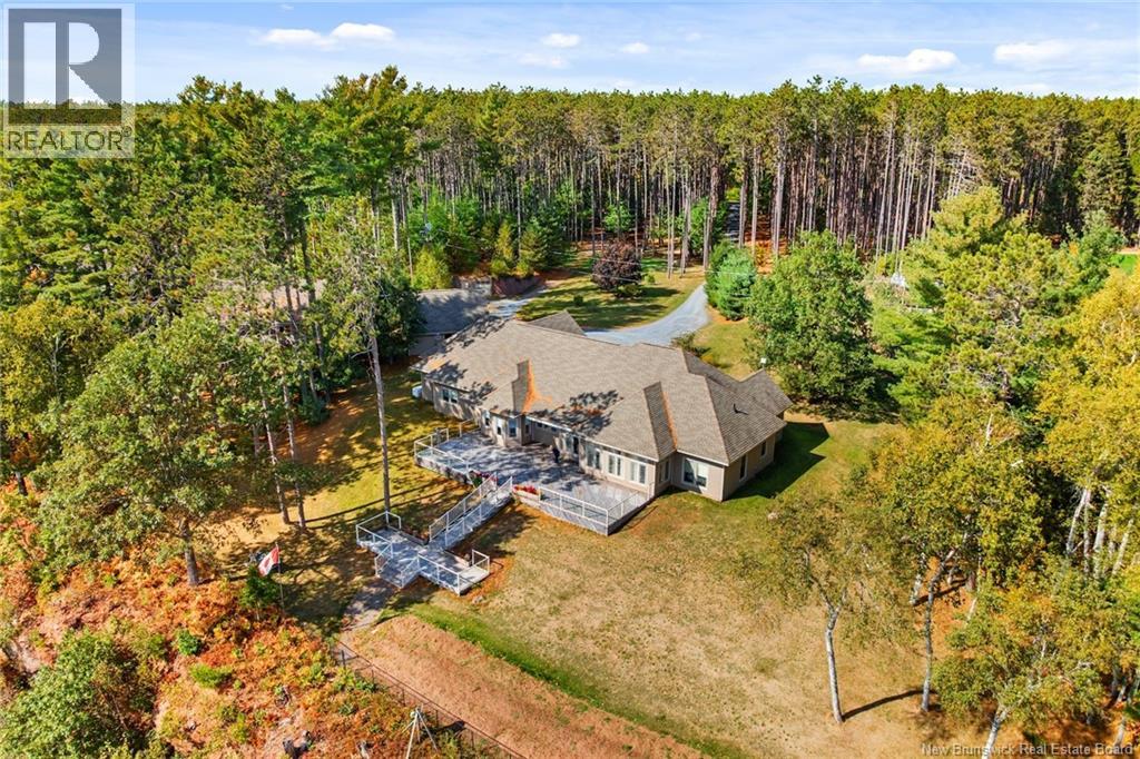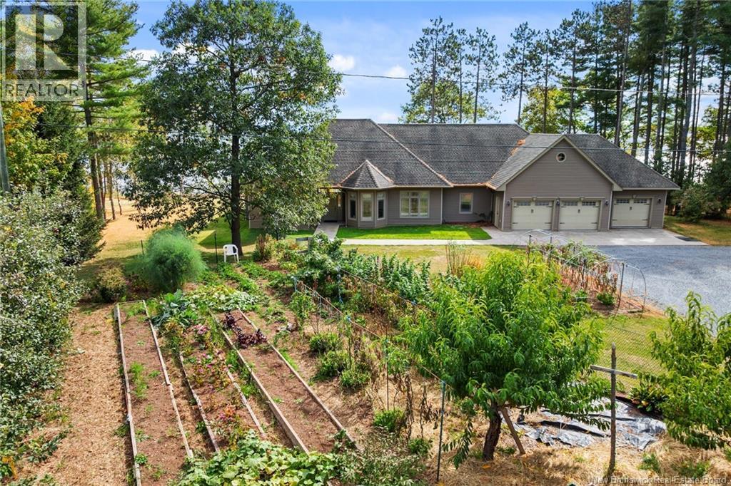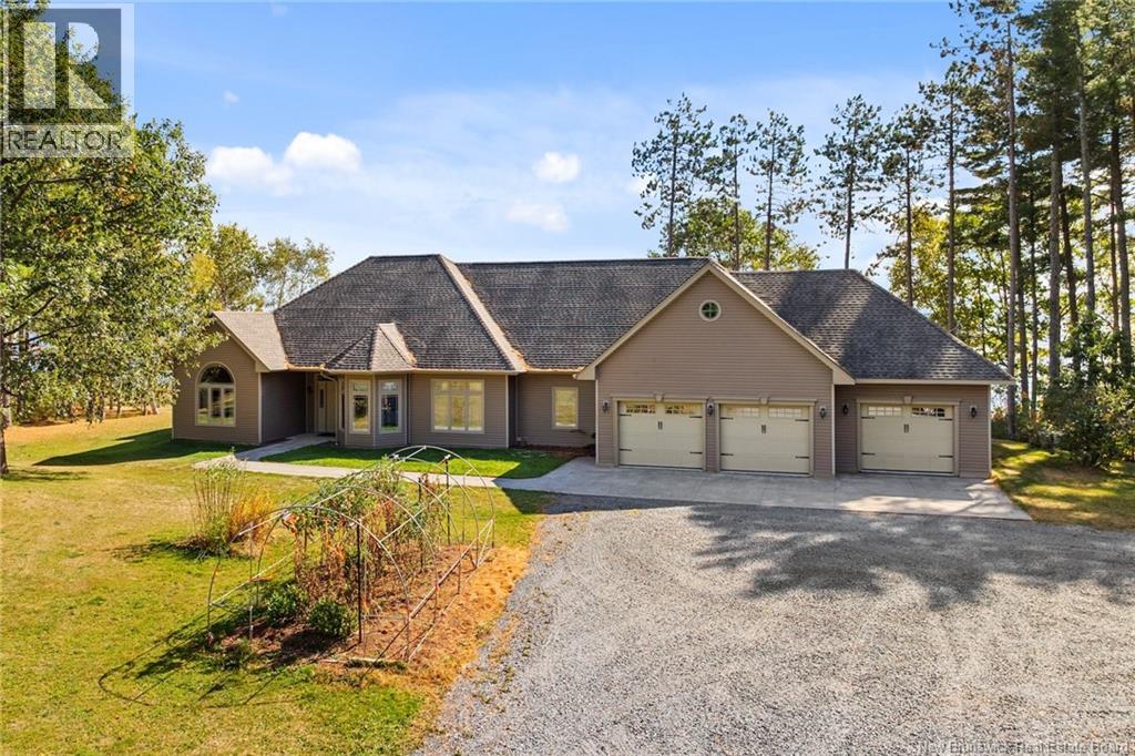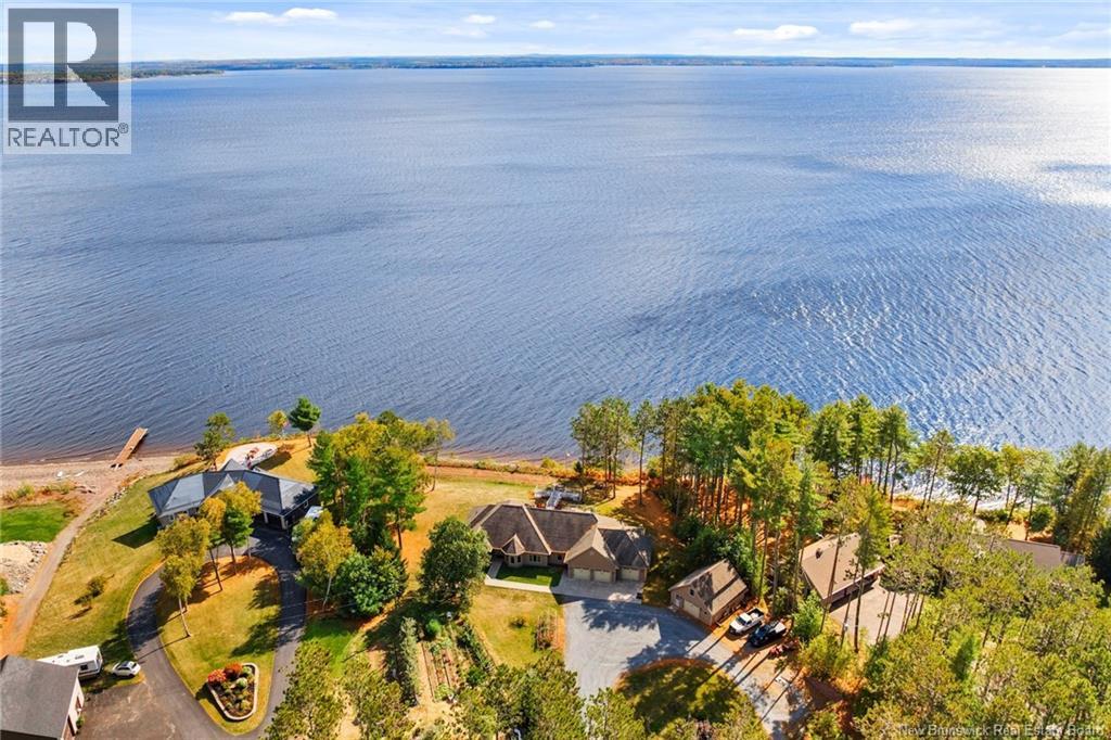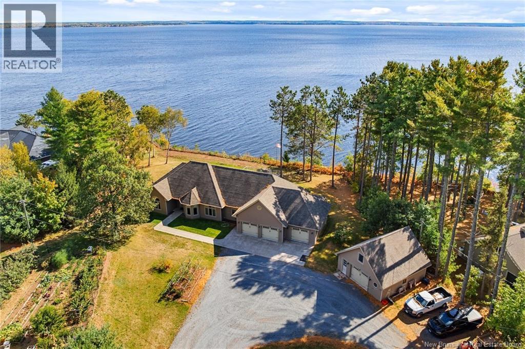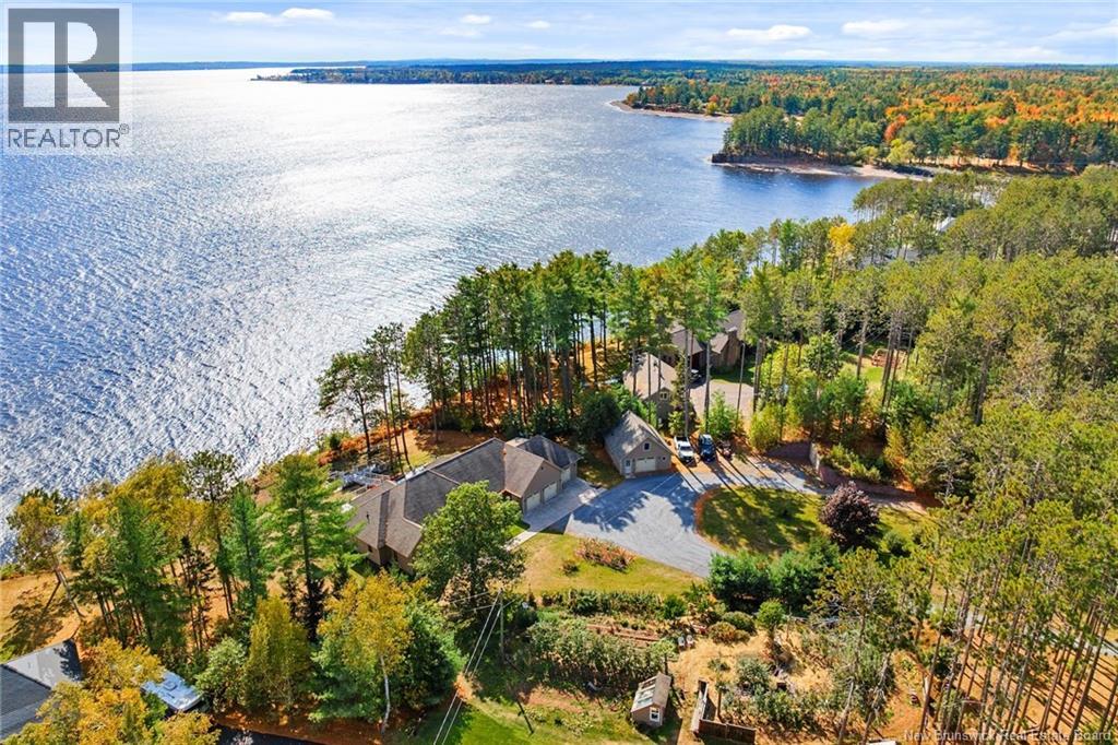 Welcome to The Pines, an extraordinary opportunity to own an executive-style home with panoramic views of Grand Lake. This property boasts 3 acres in one of New Brunswicks most desirable lakefront communities. Ownership includes membership to the exclusive 9-hole golf course and a boat slip at the private marina-the ultimate in luxury, leisure, and lifestyle. As you approach via the stately pine-lined driveway, the beauty of this property reveals itself. Step inside to soaring ceilings, expansive windows, and unobstructed water views from nearly every room. The heart of the home is a grand family room-ideal for gatherings-flanked by a chefs kitchen, formal dining room and grand foyer. Designed with comfort and functionality in mind, the home features a thoughtfully positioned office with garden views. The private master suite with a spa-like ensuite and lake views features his and hers closets. Additional bedrooms and a full bath are located on the opposite wing, ensuring space and privacy. A spacious laundry connects to the attached 3-bay garage, with new epoxy flooring. Outside, you'll find a detached garage with potential for a guest cottage conversion, as well as a clever underground storage unit for your golf cart and toys. For the green-thumbed, enjoy the mature garden featuring fruit bearing trees and perennial veggies. This property is set high and dry-safe from flooding. Whether you're seeking a year-round residence or a show stopping seasonal retreat, this is it. (id:34572)