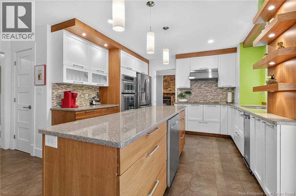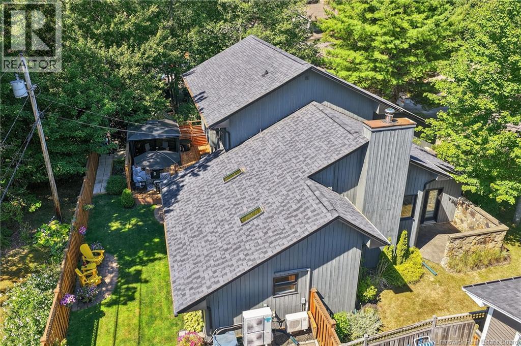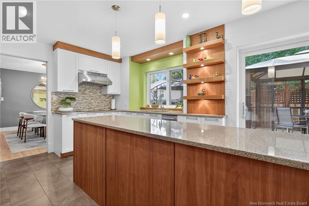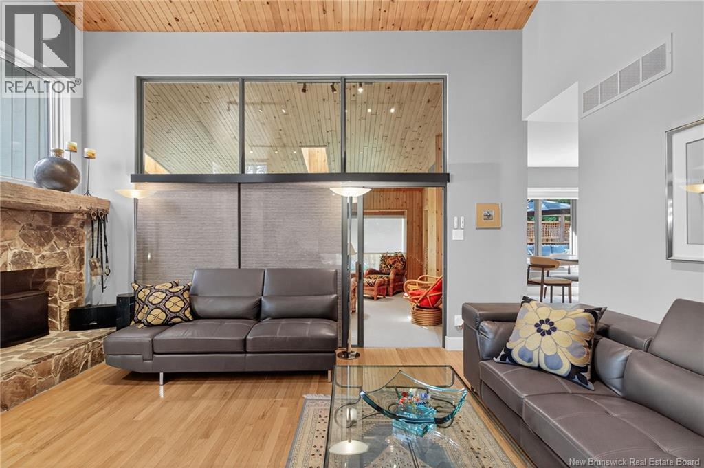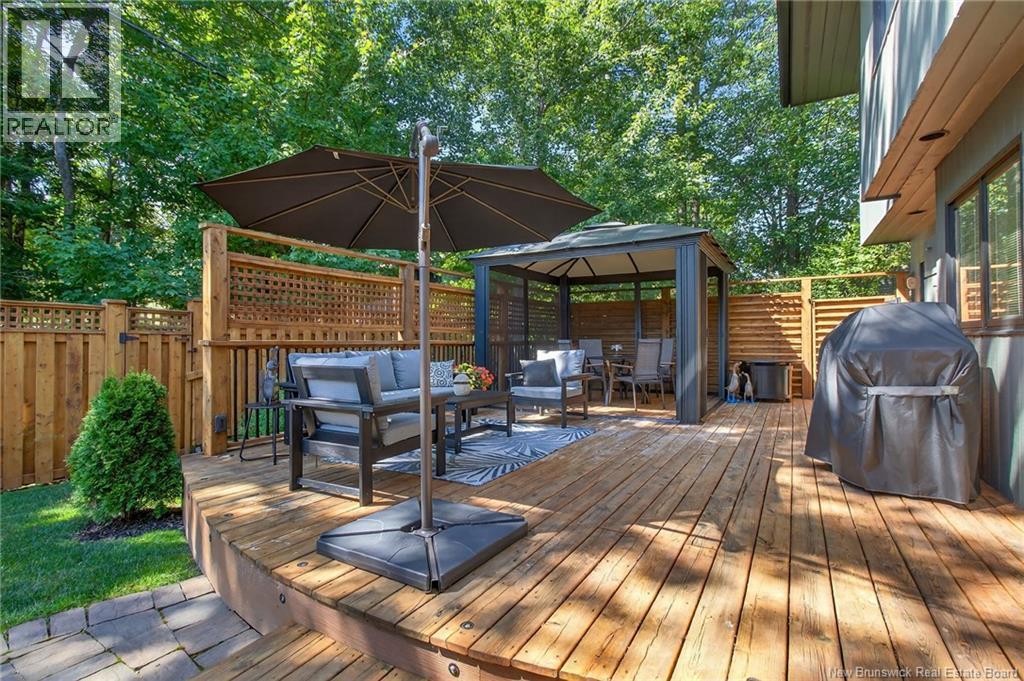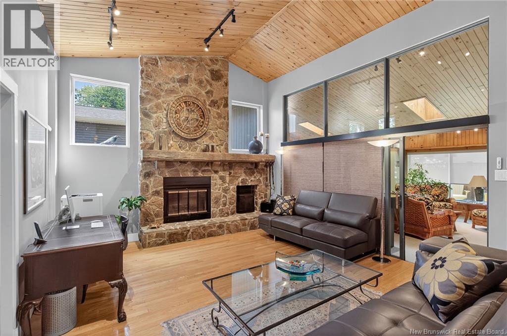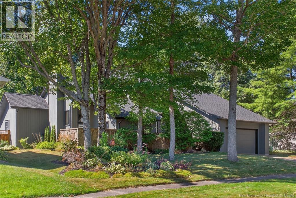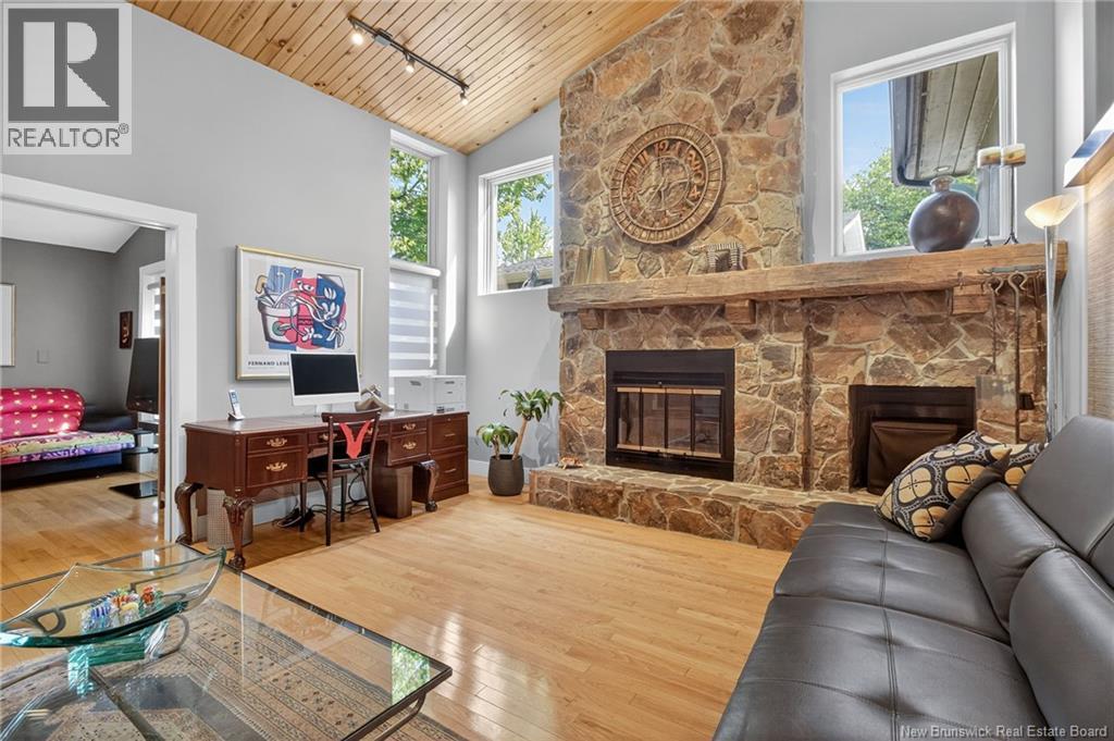 Welcome to this contemporary 3-bedroom home in Centennial Place, blending modern comfort with natural surroundings. Mature trees & lush perennials add to its great curb appeal. Step inside to a spacious, inviting foyer. When entering the sunken living room, the natural light flowing in, the striking stone wood-burning fireplace & vaulted pine ceiling set the tone for warmth & character. Pocket doors lead to a private den/office with optional patio access to a stone terrace, ideal for quiet moments. The kitchen is both stylish & functional, featuring two-tone cabinetry, quartz counters, centre island, built-in appliances, including a trash compactor, pantry & oversized patio doors leading to a stylish, private deck. A bright sunroom offers panoramic views of the backyard oasis. Fitness room, dining room, 2pc bath & laundry complete the main level. Upstairs, the primary suite features a 5pc ensuite with soaker tub, rain shower - plus a spacious walk-in closet. 2 additional bedrooms share a 4pc family bath. The finished lower level extends your living space with a large family room, hobby room & storage. Additional highlights include central air, central & convenient location - being only 5 min from downtown, Riverview, Trinity Shopping & highways. Heated floors in kitchen & ensuite bath & central vac. A true blend of style, comfort & privacy in one of Monctons most sought-after neighbourhoods. Don't delay, schedule your private showing today. (id:34572)