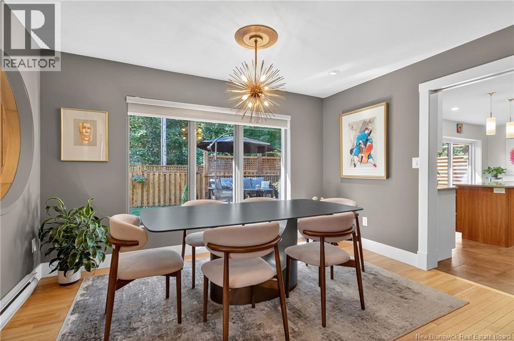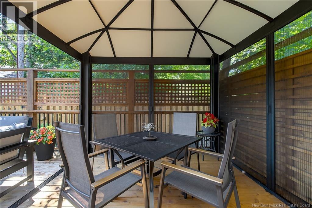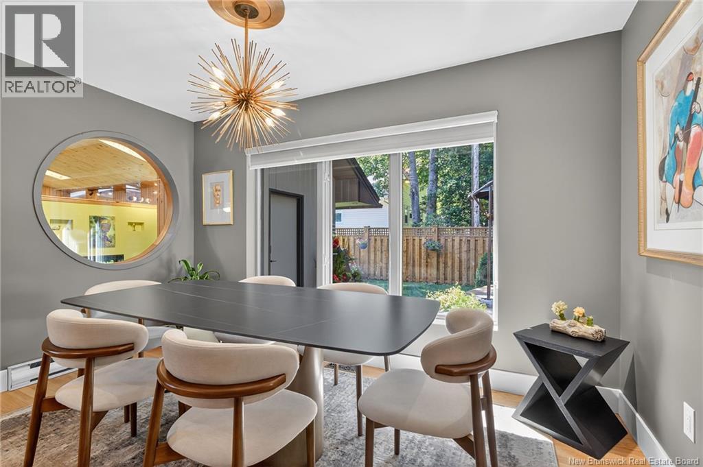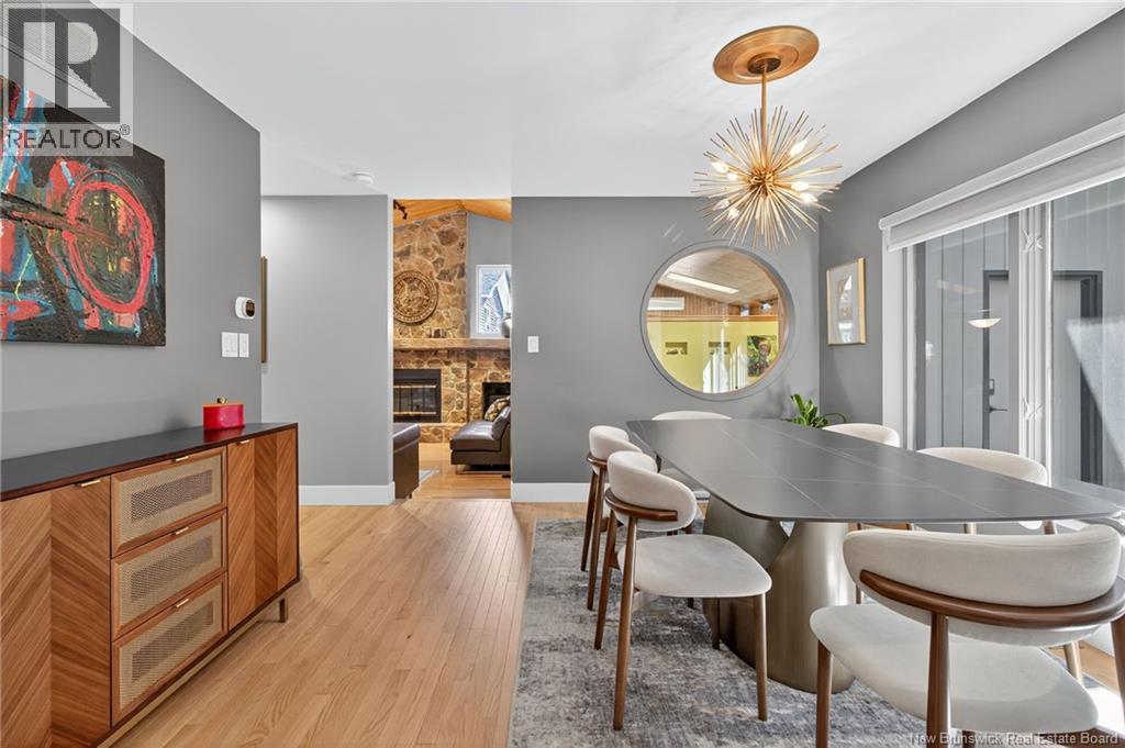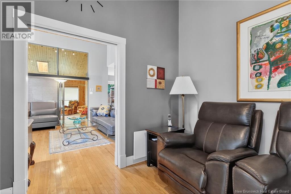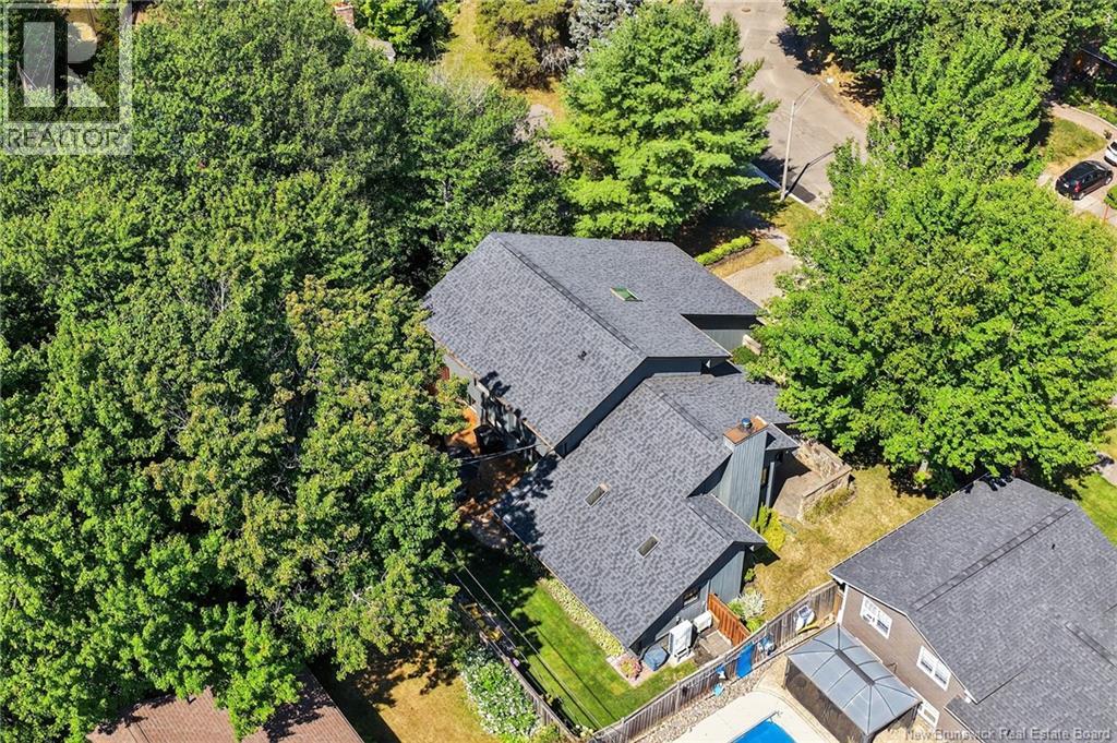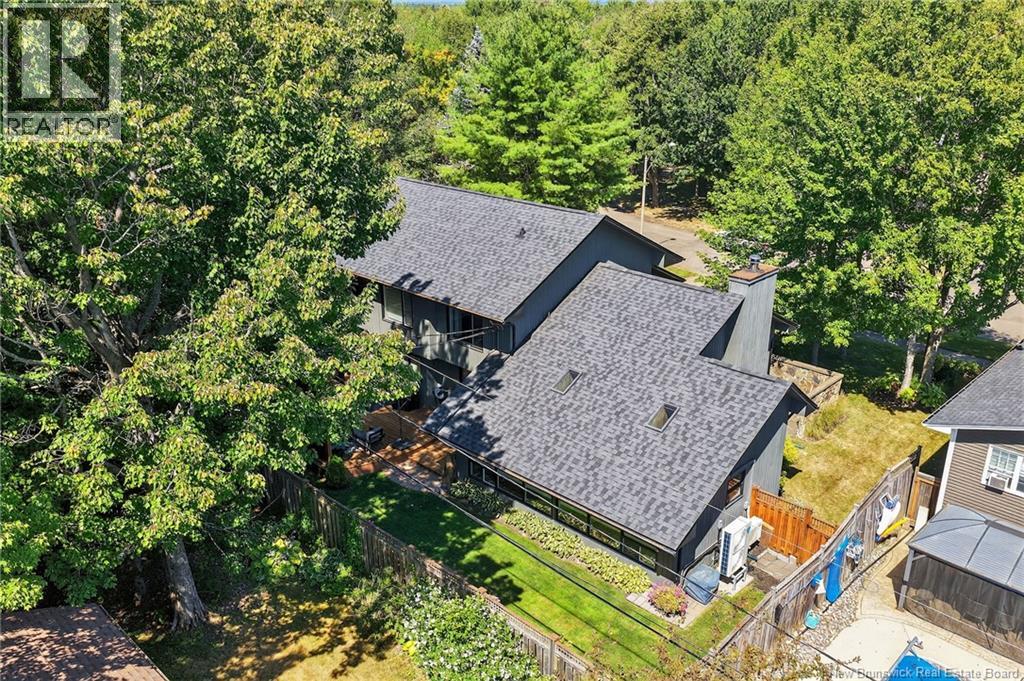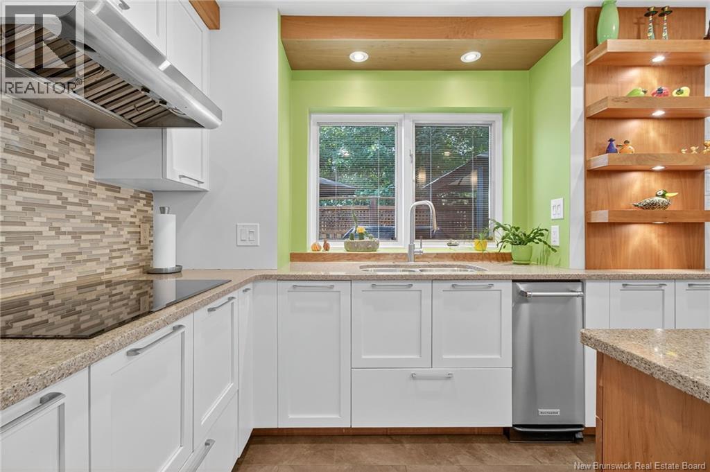 Welcome to this contemporary 3-bedroom home in Centennial Place, blending modern comfort with natural surroundings. Mature trees & lush perennials add to its great curb appeal. Step inside to a spacious, inviting foyer. When entering the sunken living room, the natural light flowing in, the striking stone wood-burning fireplace & vaulted pine ceiling set the tone for warmth & character. Pocket doors lead to a private den/office with optional patio access to a stone terrace, ideal for quiet moments. The kitchen is both stylish & functional, featuring two-tone cabinetry, quartz counters, centre island, built-in appliances, including a trash compactor, pantry & oversized patio doors leading to a stylish, private deck. A bright sunroom offers panoramic views of the backyard oasis. Fitness room, dining room, 2pc bath & laundry complete the main level. Upstairs, the primary suite features a 5pc ensuite with soaker tub, rain shower - plus a spacious walk-in closet. 2 additional bedrooms share a 4pc family bath. The finished lower level extends your living space with a large family room, hobby room & storage. Additional highlights include central air, central & convenient location - being only 5 min from downtown, Riverview, Trinity Shopping & highways. Heated floors in kitchen & ensuite bath & central vac. A true blend of style, comfort & privacy in one of Monctons most sought-after neighbourhoods. Don't delay, schedule your private showing today. (id:34572)