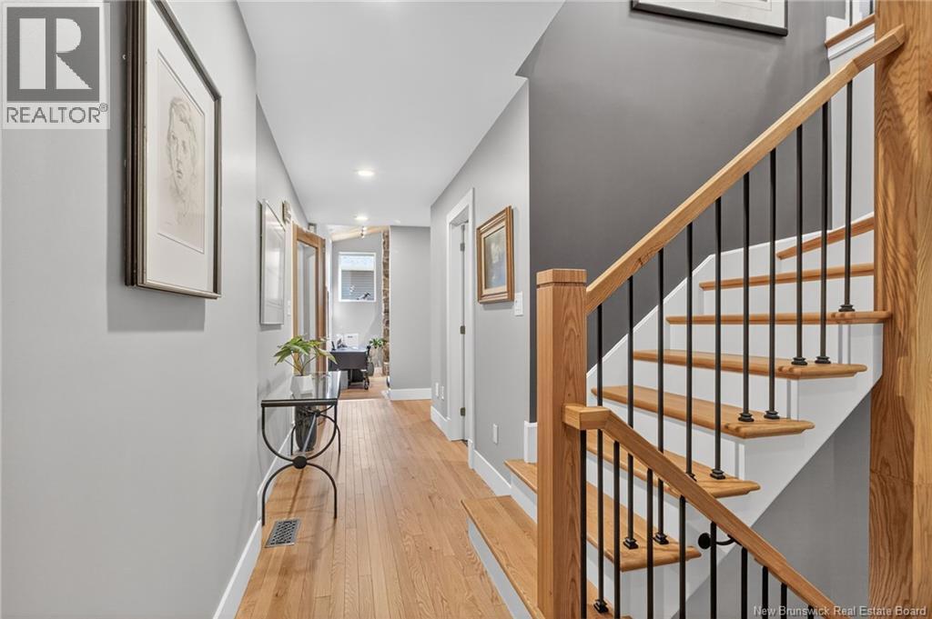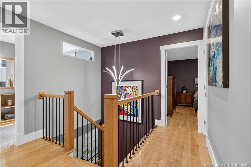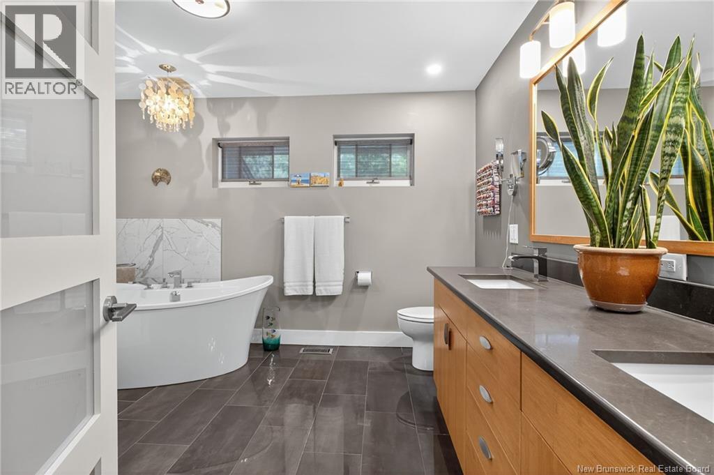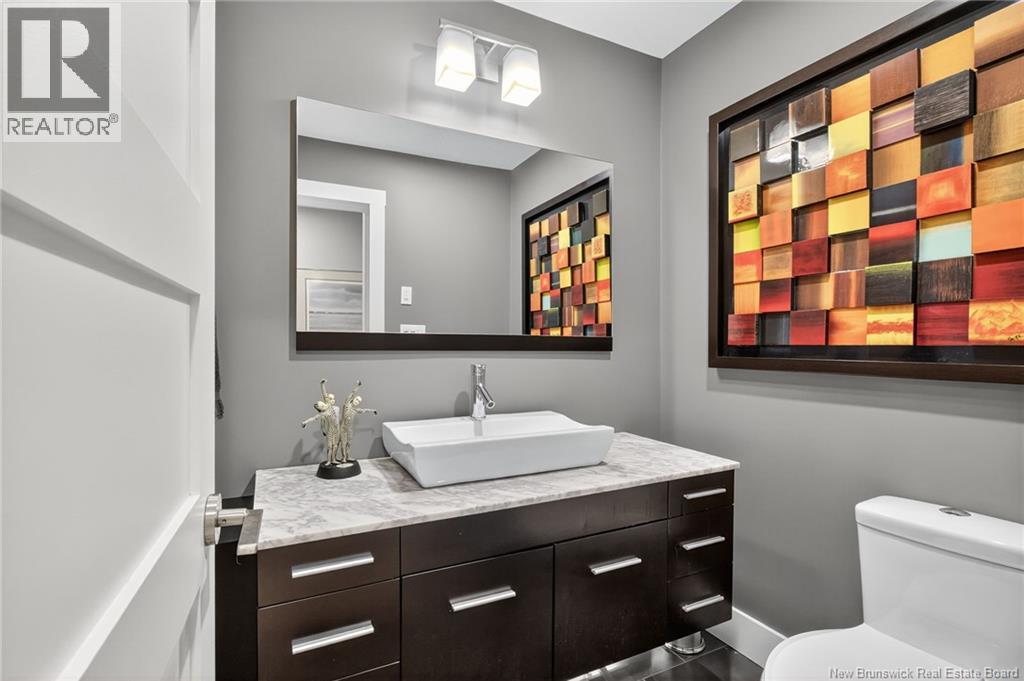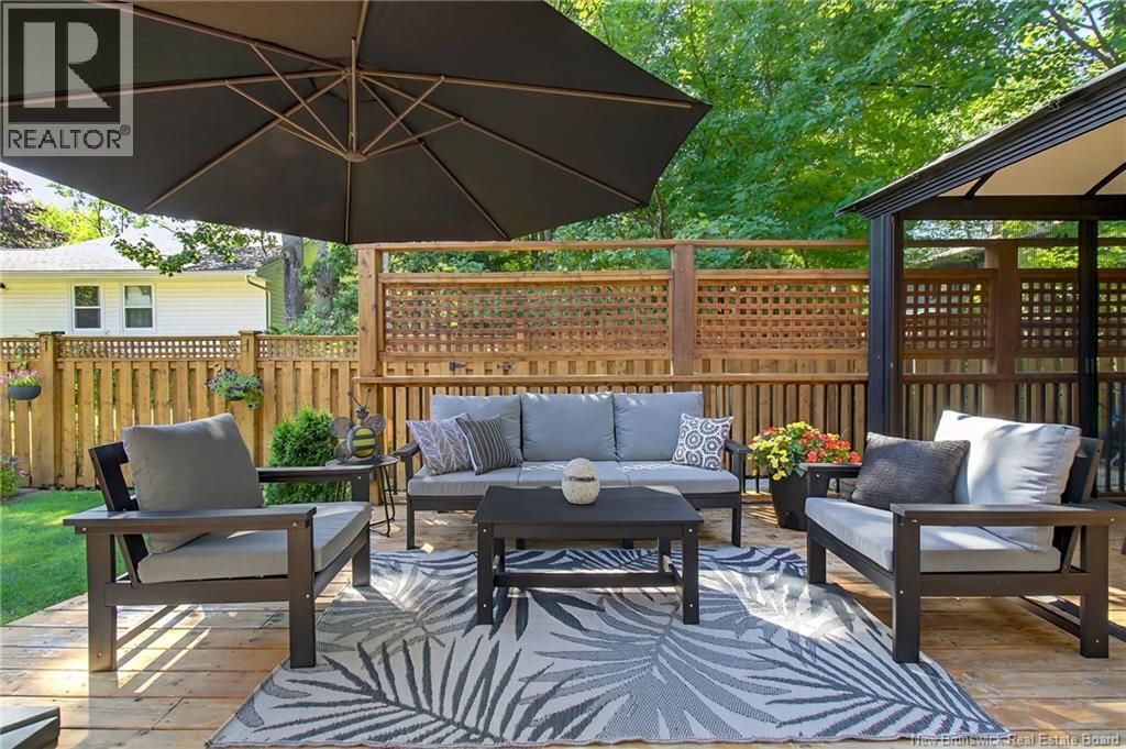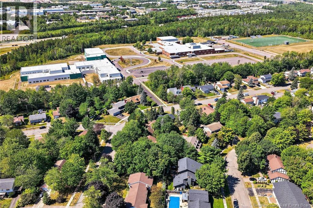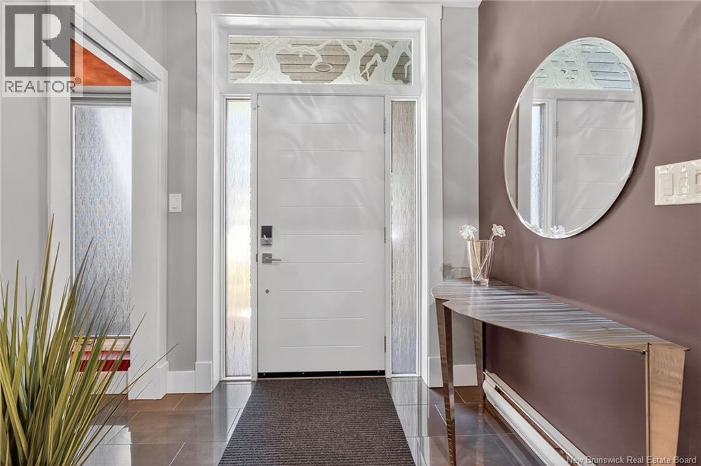 Welcome to this contemporary 3-bedroom home in Centennial Place, blending modern comfort with natural surroundings. Mature trees & lush perennials add to its great curb appeal. Step inside to a spacious, inviting foyer. When entering the sunken living room, the natural light flowing in, the striking stone wood-burning fireplace & vaulted pine ceiling set the tone for warmth & character. Pocket doors lead to a private den/office with optional patio access to a stone terrace, ideal for quiet moments. The kitchen is both stylish & functional, featuring two-tone cabinetry, quartz counters, centre island, built-in appliances, including a trash compactor, pantry & oversized patio doors leading to a stylish, private deck. A bright sunroom offers panoramic views of the backyard oasis. Fitness room, dining room, 2pc bath & laundry complete the main level. Upstairs, the primary suite features a 5pc ensuite with soaker tub, rain shower - plus a spacious walk-in closet. 2 additional bedrooms share a 4pc family bath. The finished lower level extends your living space with a large family room, hobby room & storage. Additional highlights include central air, central & convenient location - being only 5 min from downtown, Riverview, Trinity Shopping & highways. Heated floors in kitchen & ensuite bath & central vac. A true blend of style, comfort & privacy in one of Monctons most sought-after neighbourhoods. Don't delay, schedule your private showing today. (id:34572)