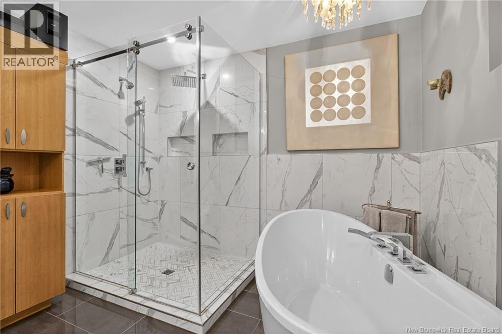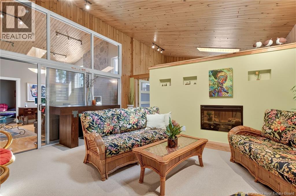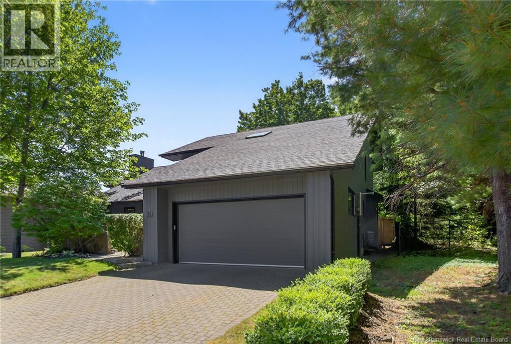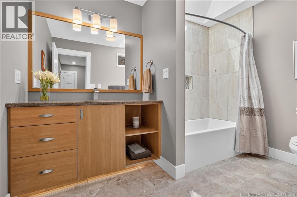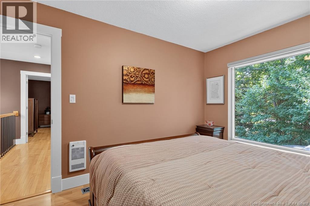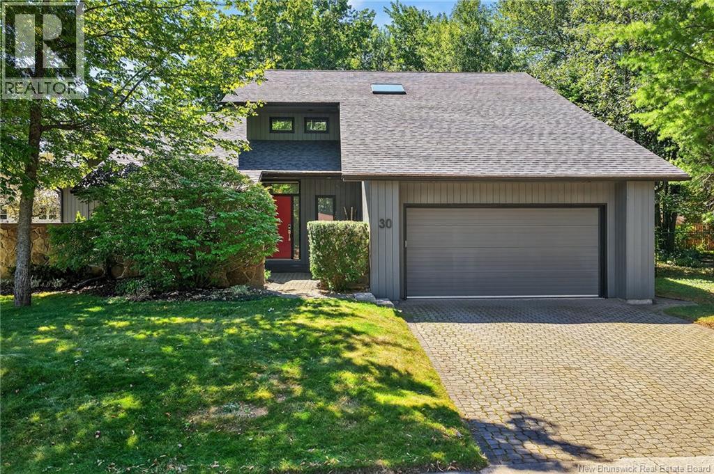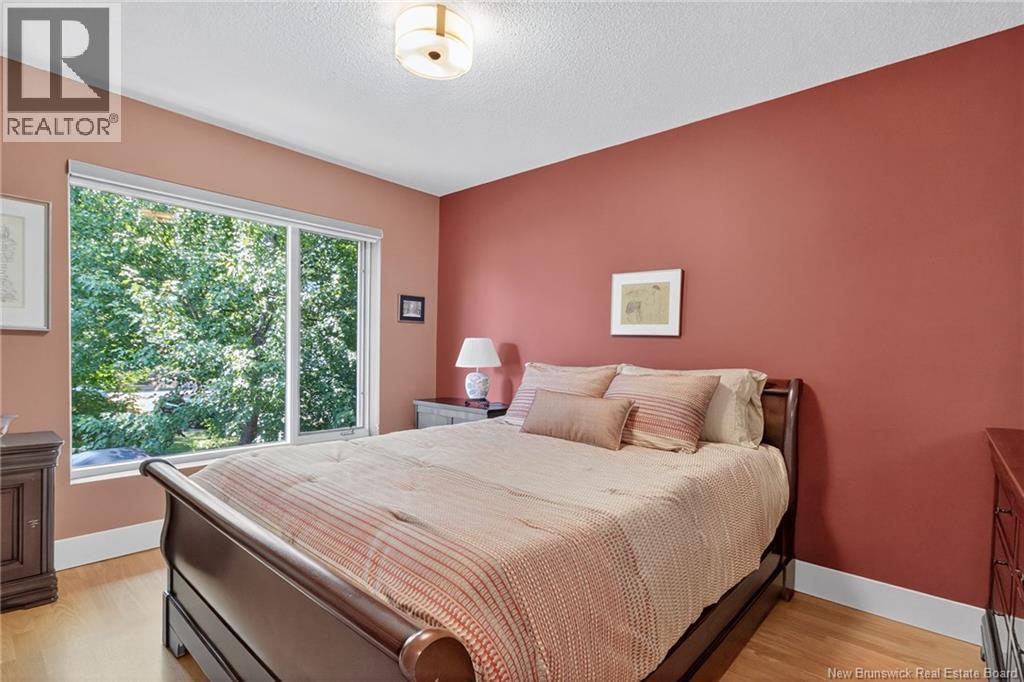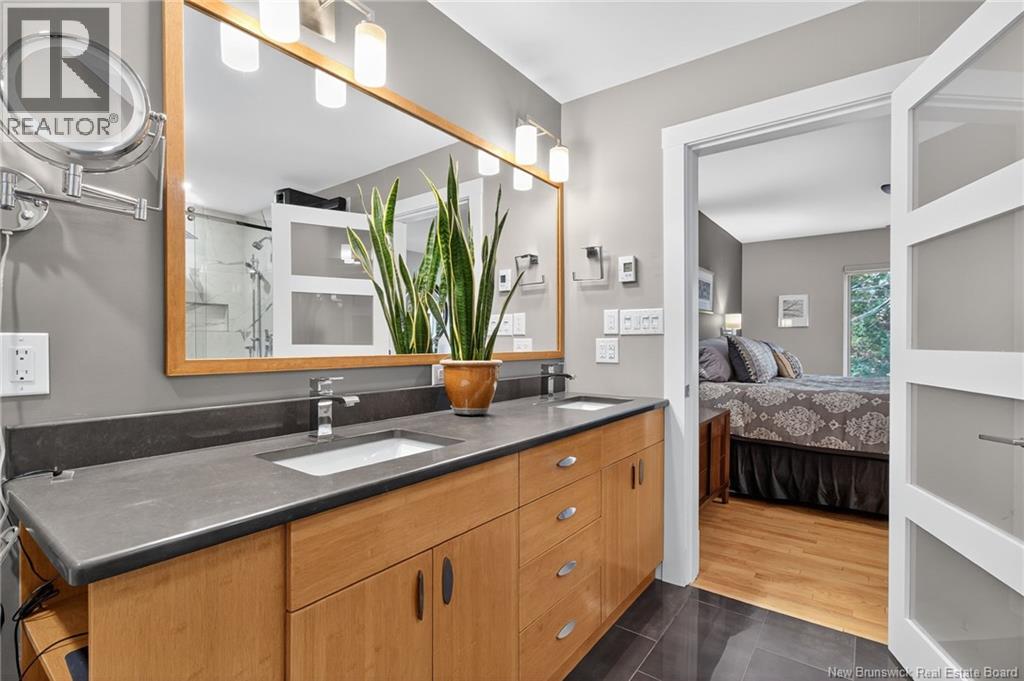 Welcome to this contemporary 3-bedroom home in Centennial Place, blending modern comfort with natural surroundings. Mature trees & lush perennials add to its great curb appeal. Step inside to a spacious, inviting foyer. When entering the sunken living room, the natural light flowing in, the striking stone wood-burning fireplace & vaulted pine ceiling set the tone for warmth & character. Pocket doors lead to a private den/office with optional patio access to a stone terrace, ideal for quiet moments. The kitchen is both stylish & functional, featuring two-tone cabinetry, quartz counters, centre island, built-in appliances, including a trash compactor, pantry & oversized patio doors leading to a stylish, private deck. A bright sunroom offers panoramic views of the backyard oasis. Fitness room, dining room, 2pc bath & laundry complete the main level. Upstairs, the primary suite features a 5pc ensuite with soaker tub, rain shower - plus a spacious walk-in closet. 2 additional bedrooms share a 4pc family bath. The finished lower level extends your living space with a large family room, hobby room & storage. Additional highlights include central air, central & convenient location - being only 5 min from downtown, Riverview, Trinity Shopping & highways. Heated floors in kitchen & ensuite bath & central vac. A true blend of style, comfort & privacy in one of Monctons most sought-after neighbourhoods. Don't delay, schedule your private showing today. (id:34572)