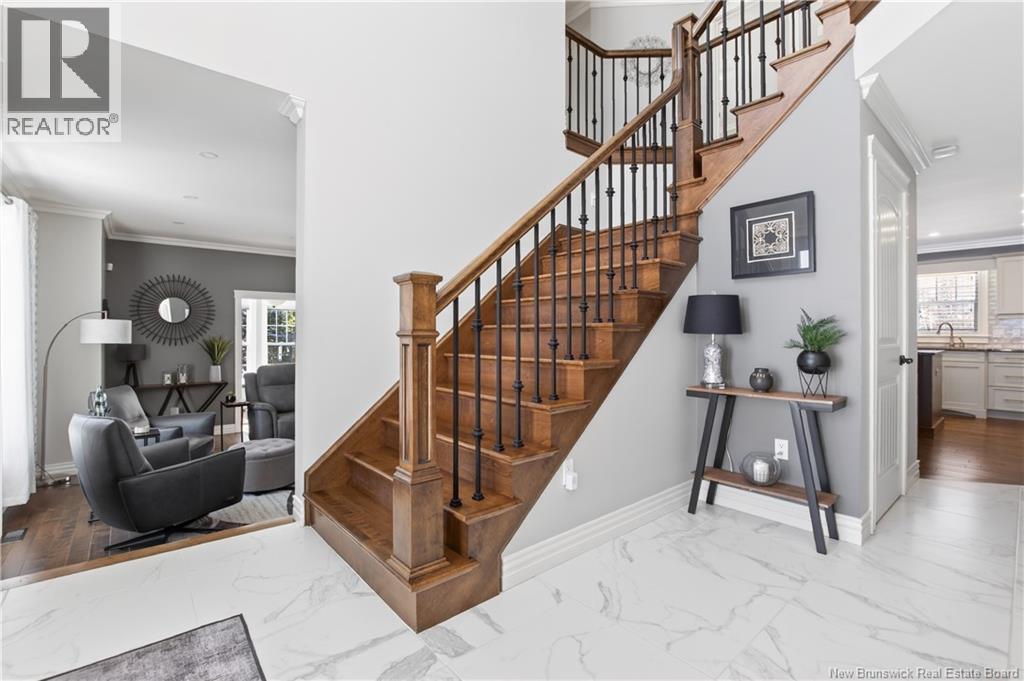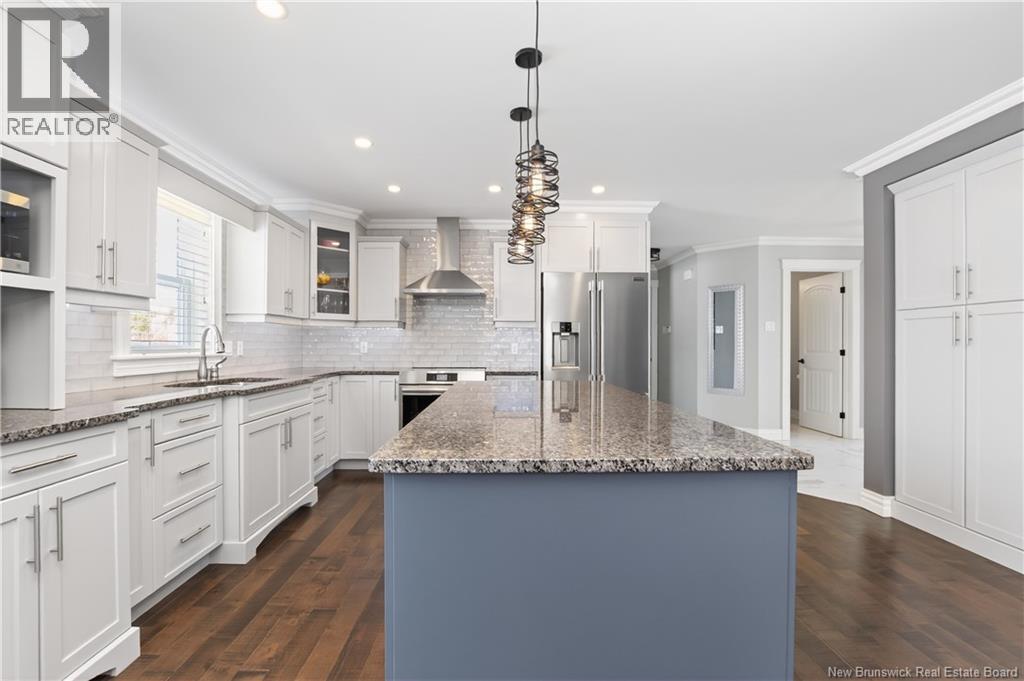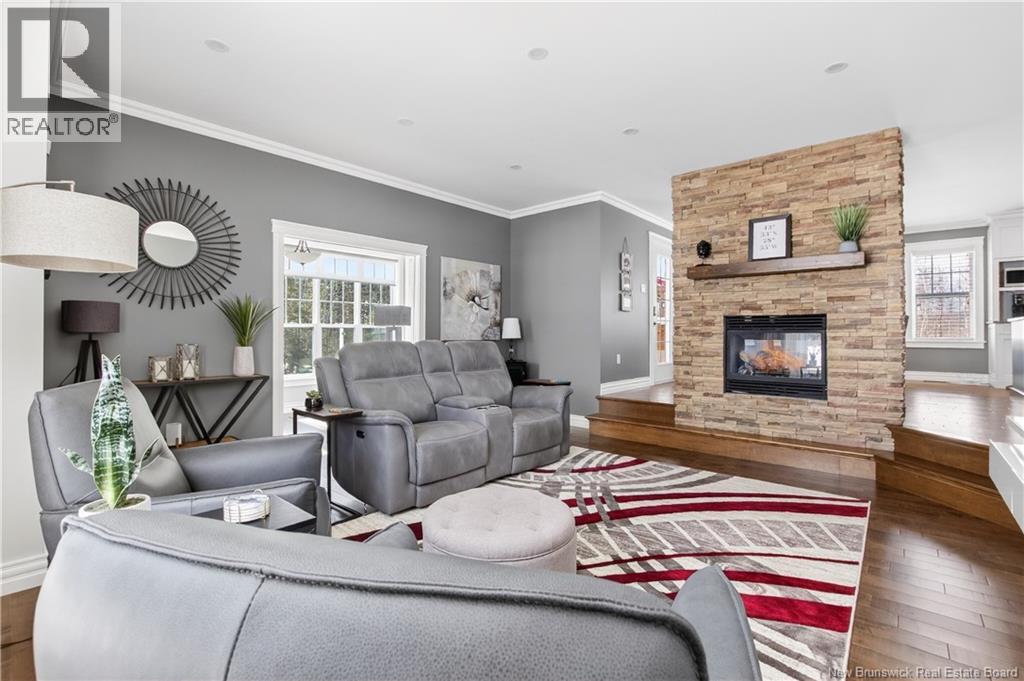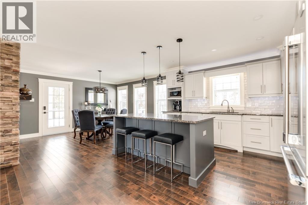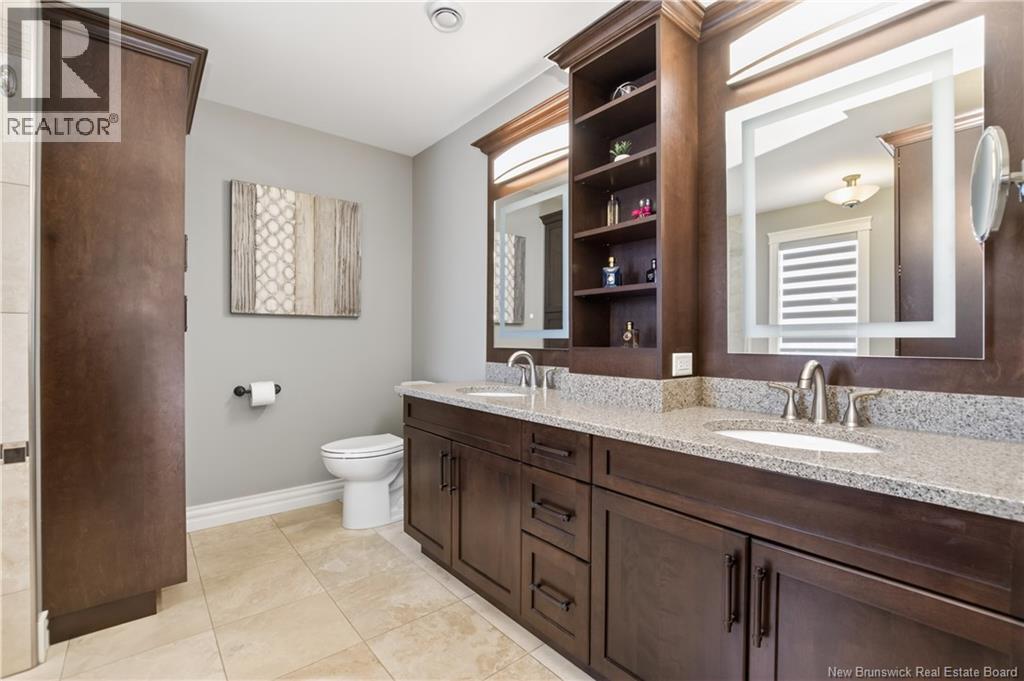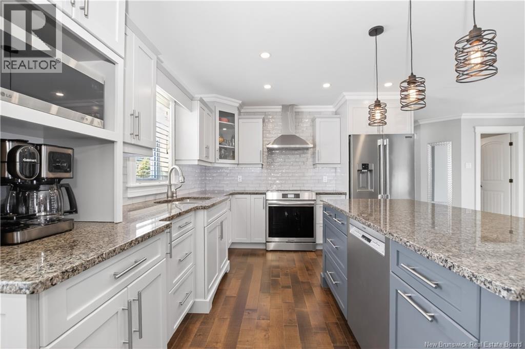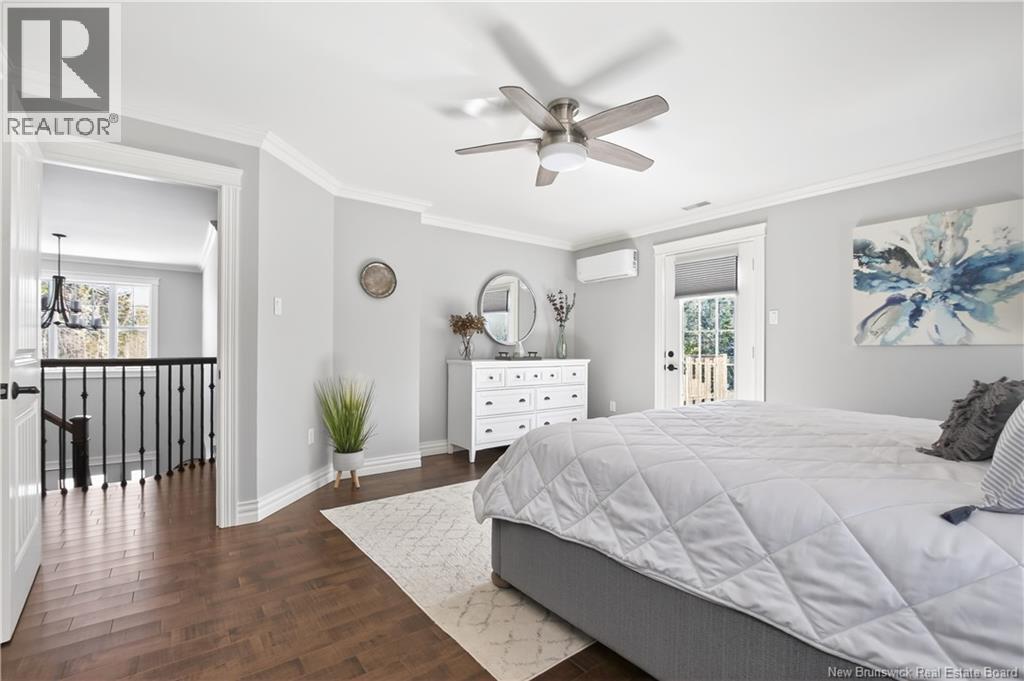 Tucked away on a quiet cul-de-sac in the highly sought-after community of Ammon, this home offers a perfect blend of elegance, comfort, and privacy. Set on a beautifully landscaped lot minutes from Monctons amenities, this impressive home is equipped with an efficient GEOTHERMAL heating and cooling system, delivering year-round comfort with reduced energy costs. From the moment you enter, youll notice the refined design and spacious layout. Large windows fill the home with natural light, showcasing quality finishes and thoughtful details throughout. The main living area flows seamlessly into a stunning kitchen designed for both everyday living and entertaining, featuring ample cabinetry, generous counter space, and a large island ideal for gathering with family and friends. The main floor also includes a private office, sunroom, a convenient mudroom, and a 2-piece bath. Upstairs are 3 generously sized bedrooms, laundry and a 4-piece bath. The luxurious primary suite offers a 5-piece ensuite, large walk-in closet with custom built-ins and a private deck, perfect for morning coffee or evening relaxation. All decks are composite for durability and low-maintenance enjoyment. The basement offers a spacious family room, providing excellent additional living space. Outside, enjoy the peaceful backyard setting, plus a double detached garage with a full sports bar above, an exceptional space for entertaining. A rare opportunity combining estate-style living with city convenience. (id:34572)