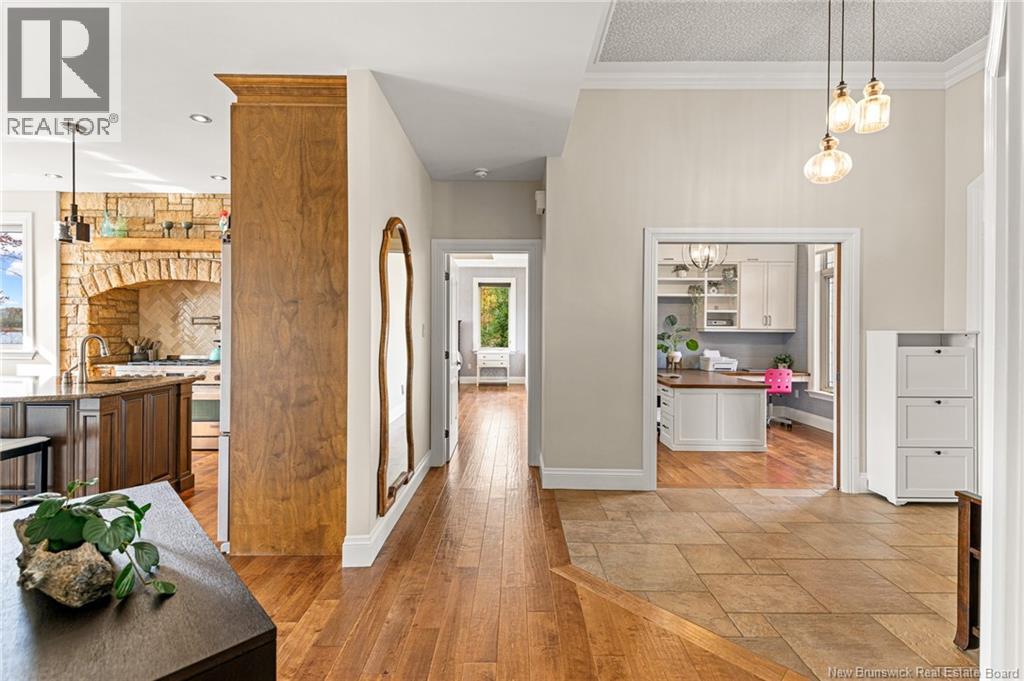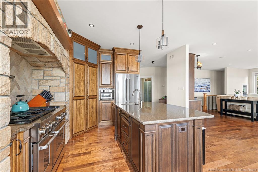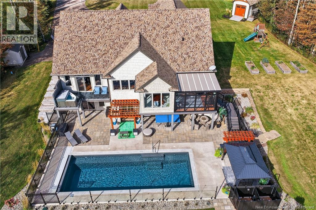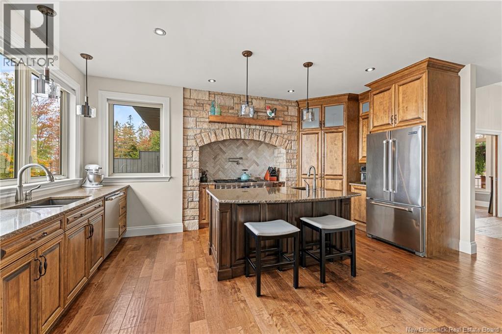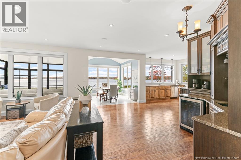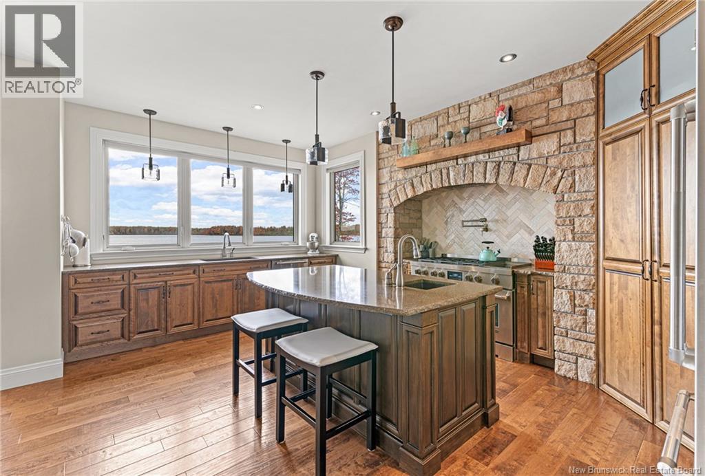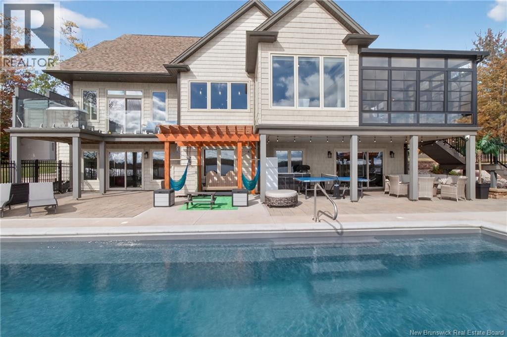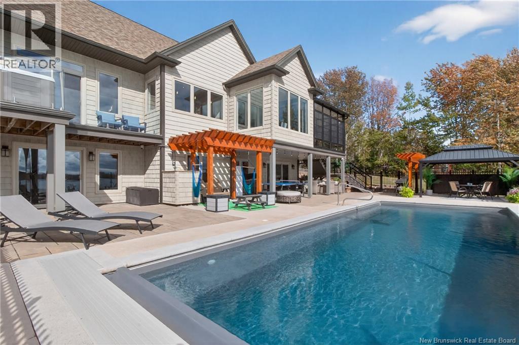 GEOTHERMAL HEATING! Welcome to 430 Square Lake in Saint-Andre, NB, where it feels like vacation every day. This exquisitely lakefront bungalow, with a walkout basement, offers 4,280 sq. ft. of refined living, where timeless craftsmanship meets modern comfort. Soaring ceilings, rich finishes, and panoramic lake views define every space. The main level features an inviting foyer, a private office, and an open-concept kitchen with granite and quartz surfaces, a large island, professional-grade appliances, and a walk-in pantry. A sun-filled dining area flows seamlessly into a 3-season gazebo with a Sunspace window system. The living room is anchored by a fireplace and complemented by a wet bar, creating the perfect space for entertaining. The primary suite offers a walk-in closet, a spa-inspired ensuite with a tiled shower, and a private balcony with a hot tub overlooking the water. A versatile bonus room sits above the heated double garage. The walkout level features a family room with a fireplace, two bedrooms, a full bath, a show-stopping wine cellar, a second living space currently used as a gym area, and a second kitchen. Outdoor living shines with a 16×40 heated saltwater pool with a retractable cover, a cedar pergola, a fire pit, a dock system, and an outdoor kitchen. Geothermal heating (3 zones), heated floors, generator panel, camera system, and soft landscape lighting complete this exceptional lakeside retreatOnly 30 minutes from the Greater Moncton airport. (id:34572)