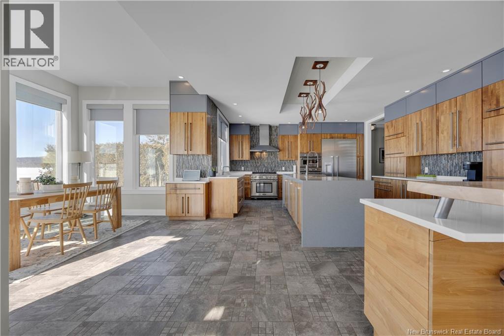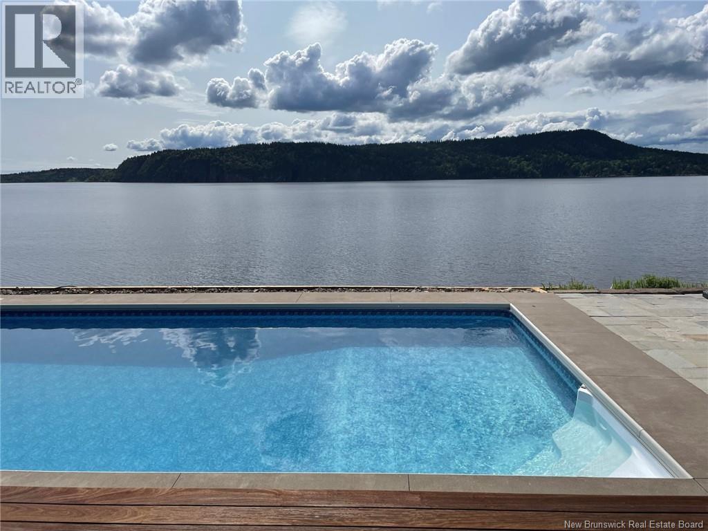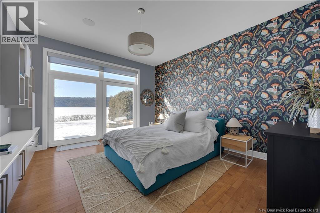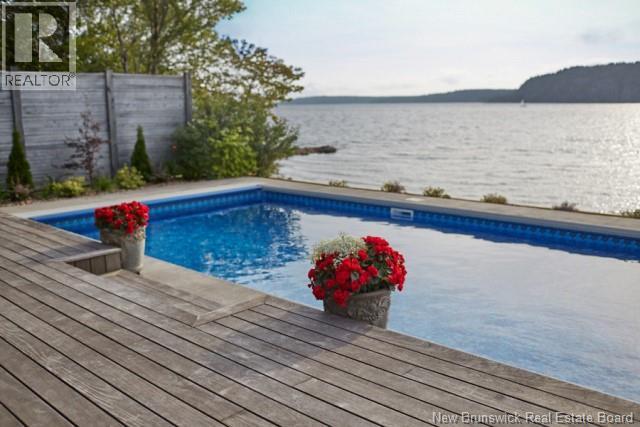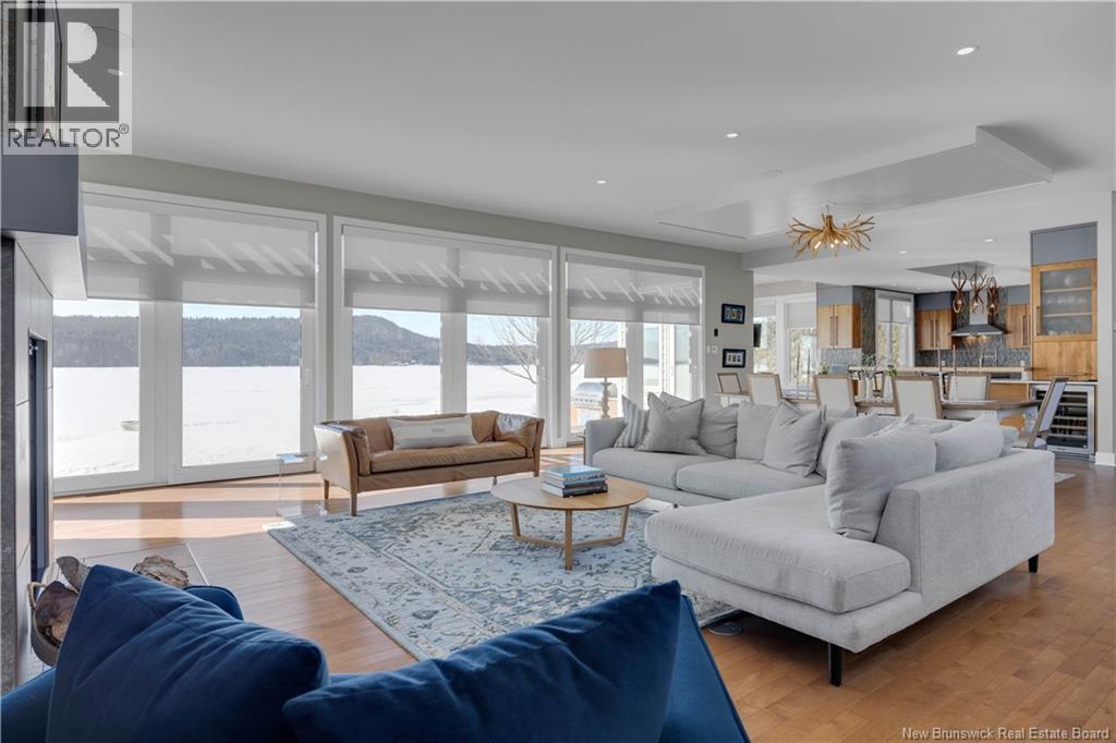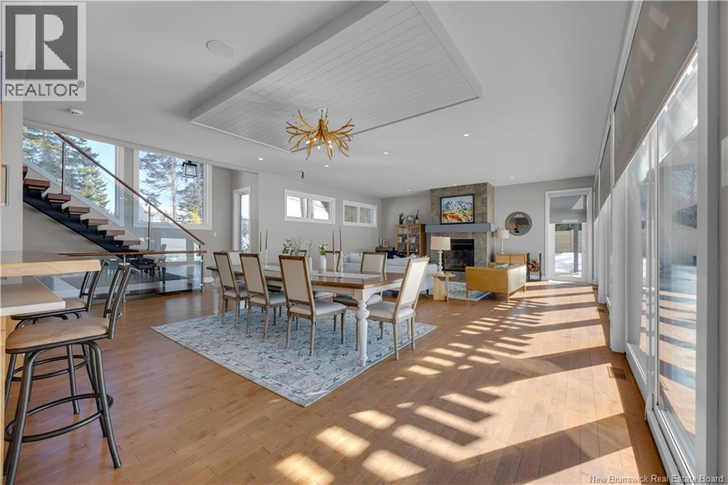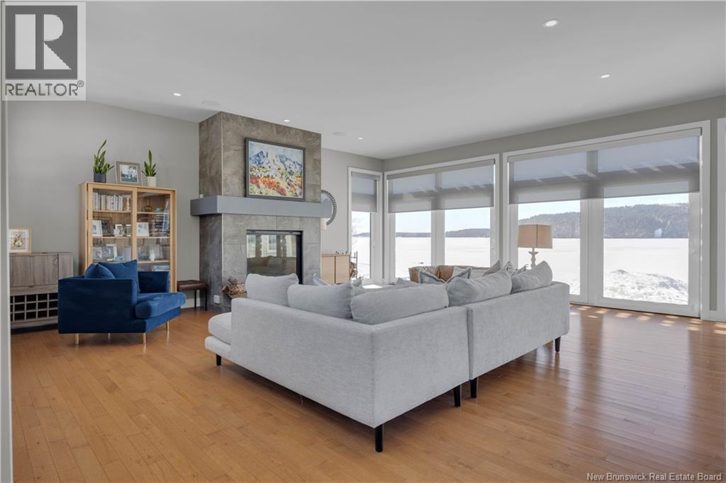 Prime Rothesay waterfront! Perched on 0.94 acres with approx 160 feet of frontage on the beautiful Kennebecasis River, this contemporary luxury home blends indoor elegance with stunning outdoor living. Expansive 10 ceilings, floor-to-ceiling windows, and glass walk-outs highlight the great room with wood burning fireplace, perfect for entertaining. Chef-inspired kitchen features walnut cabinetry, quartz waterfall island, Thermador appliances, espresso bar, and heated tile floors. Main floor office can double as 4th bedroom with full bath access. Upstairs, three oversized bedrooms all have ensuites, including a spa-like principal suite with propane fireplace, panoramic river views, and custom walk-in closet. Lofted family room with fireplace adds extra living space. Finished basement includes gym, rec room, and plenty of storage. Two geothermal heat pumps provide efficient heating and cooling. Outside, enjoy saltwater pool, composite decking, slate patios, sauna, outdoor pizza oven, and professionally landscaped private grounds. Oversized 3-car heated garage, paved driveway, and extra-wide walkway complete this exceptional riverfront retreat designed for casual elegance and entertaining. Make your waterfront dreams a reality in this unmatched beauty! (id:34572)