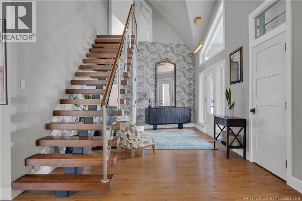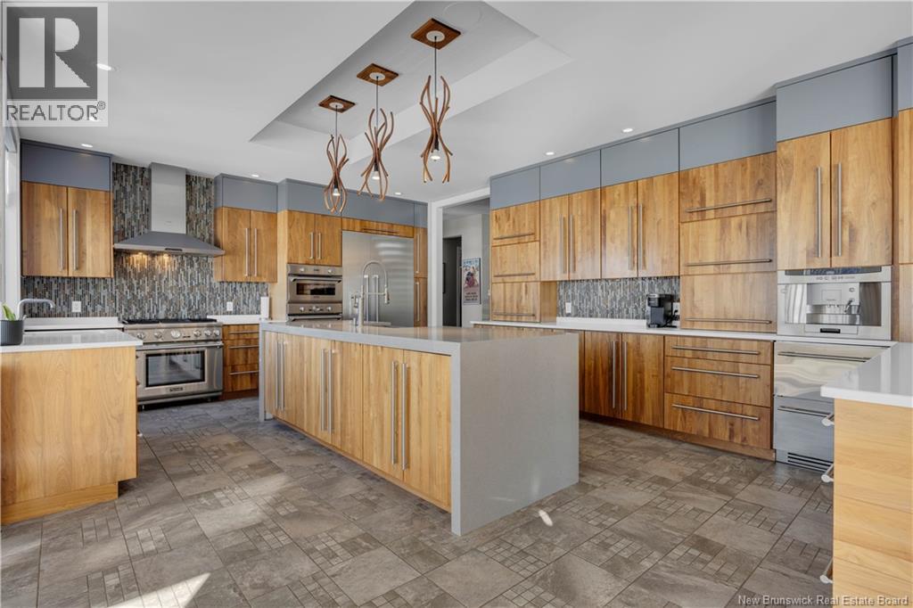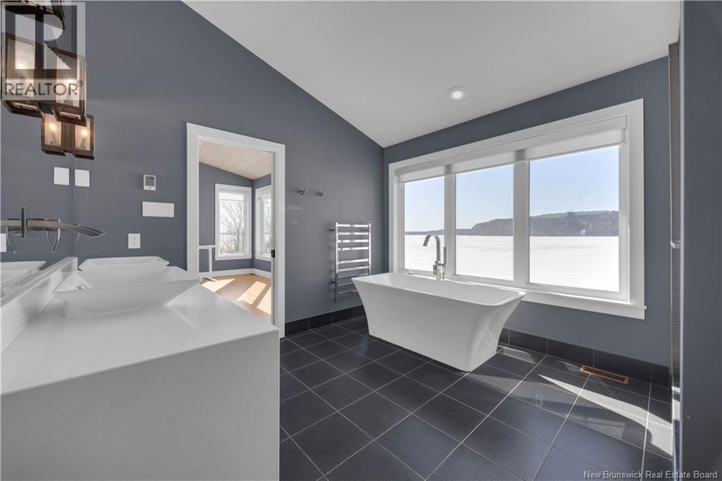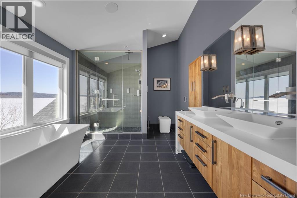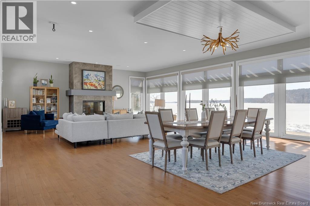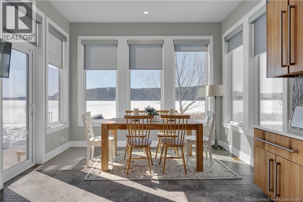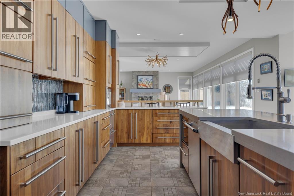 Prime Rothesay waterfront! Perched on 0.94 acres with approx 160 feet of frontage on the beautiful Kennebecasis River, this contemporary luxury home blends indoor elegance with stunning outdoor living. Expansive 10 ceilings, floor-to-ceiling windows, and glass walk-outs highlight the great room with wood burning fireplace, perfect for entertaining. Chef-inspired kitchen features walnut cabinetry, quartz waterfall island, Thermador appliances, espresso bar, and heated tile floors. Main floor office can double as 4th bedroom with full bath access. Upstairs, three oversized bedrooms all have ensuites, including a spa-like principal suite with propane fireplace, panoramic river views, and custom walk-in closet. Lofted family room with fireplace adds extra living space. Finished basement includes gym, rec room, and plenty of storage. Two geothermal heat pumps provide efficient heating and cooling. Outside, enjoy saltwater pool, composite decking, slate patios, sauna, outdoor pizza oven, and professionally landscaped private grounds. Oversized 3-car heated garage, paved driveway, and extra-wide walkway complete this exceptional riverfront retreat designed for casual elegance and entertaining. Make your waterfront dreams a reality in this unmatched beauty! (id:34572)