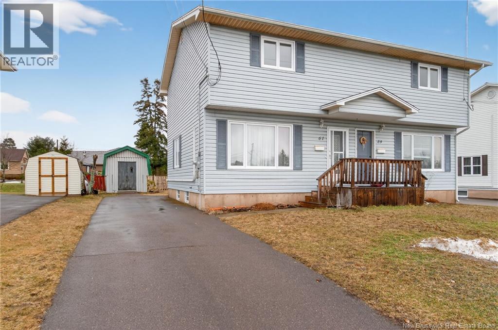 SIDE BY SIDE DUPLEX IN A GREAT LOCATION! Welcome/Bienvenue to 59-61 Berry. This duplex is ideally located in a great neighbourhood close to all amenities, schools, Costco, and the University of Moncton, making it a fantastic opportunity for both investors and owner occupants. Each unit features the same practical and inviting layout. The main floor offers a bright living room, an eat-in kitchen, and a convenient 2pc bathroom. The second floor includes two comfortable bedrooms and a full 4pc bathroom, providing a functional space for families or tenants. The lower level adds flexibility and value. Unit 59 features a fully finished basement, perfect for additional living space such as a family room, office, or recreation area. A 2pc bathroom with a convenient laundry area completes the lower level. Unit 61 basement is currently unfinished, offering great potential for future development. Additional highlights include two storage sheds, two paved driveways for ample parking, and a mini-split heat pump in unit 61 for energy efficient heating and cooling. Whether you are looking to expand your rental portfolio or live in one unit while generating income from the other, this property is a great find in a sought after location. Dont delay, call today for more information or for your own personal viewing. (id:34572)