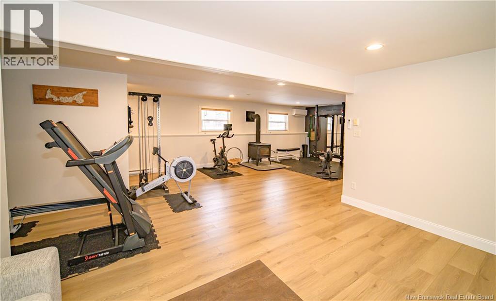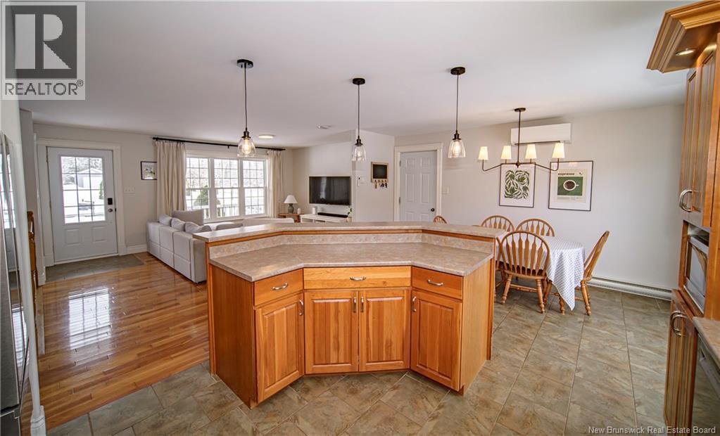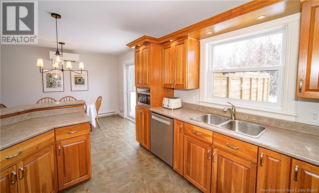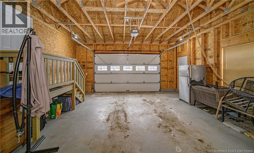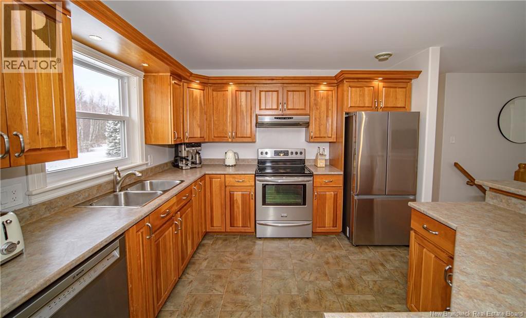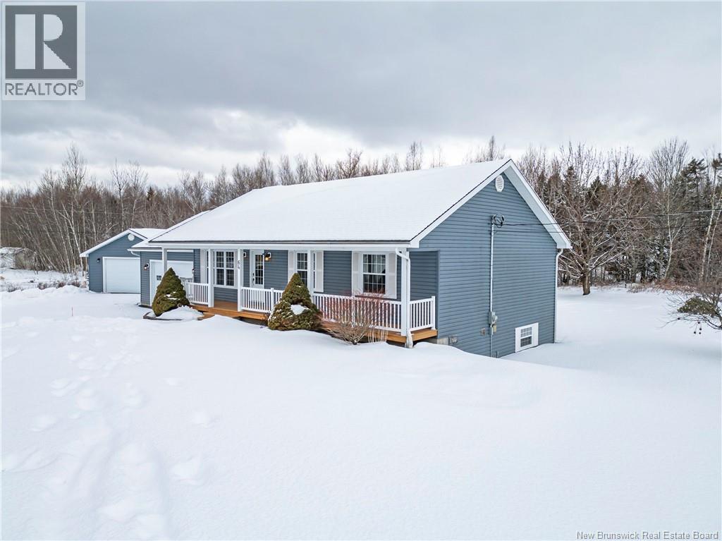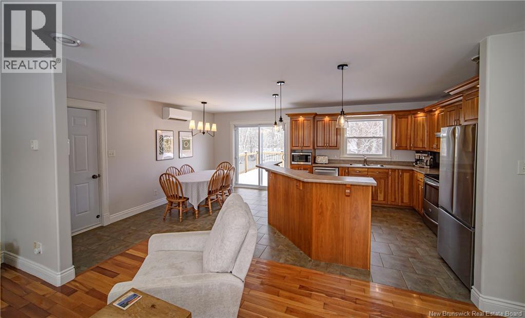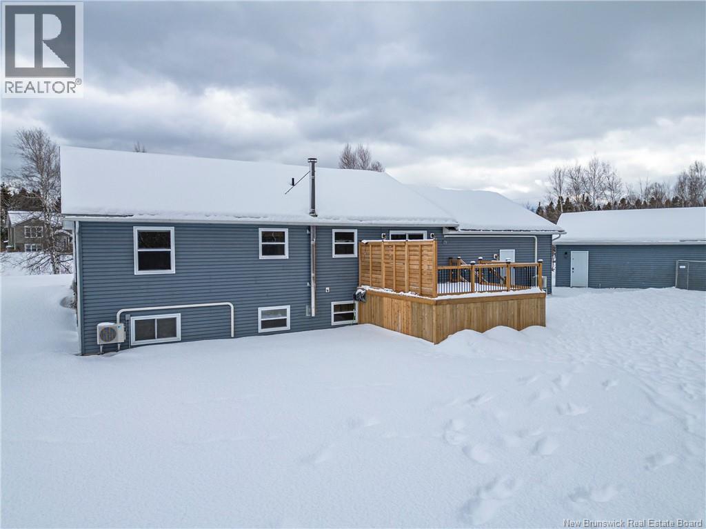 Set on a beautiful 1-acre lot in a family-friendly subdivision just minutes from Oromocto, this inviting home offers space, functionality, and standout features. Two double car garages provide exceptional storage and versatility, while the covered verandah adds charm and curb appeal. The main level features bright open-concept living, anchored by a well-designed kitchen with an abundance of cherry cabinets, generous counter space, a large island with extra storage, a raised breakfast bar ideal for casual meals and gatherings. Off dining area there are patio doors leading to a newer 16x16 large deck, an excellent outdoor entertaining space. The primary bedroom is privately located at the back of the home, with two additional bedrooms positioned at the front. A spacious main bathroom includes a linen closet and plenty of storage. The finished lower level expands the living space with a fourth bedroom, second full bathroom with laundry, storage room, and a very large rec room and family room complete with a wood stove for cozy evenings, plus walk-up access to the attached garage. This well-rounded property is ideal for family living, with quick closing available. Garage measurements: attached 22 x 26, detached 22 x 30. (id:34572)