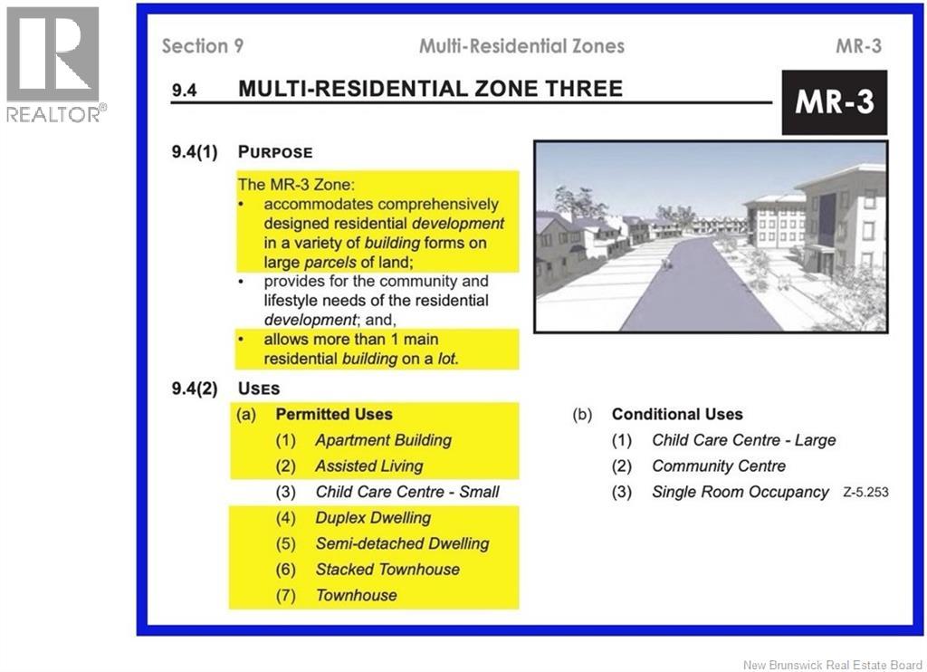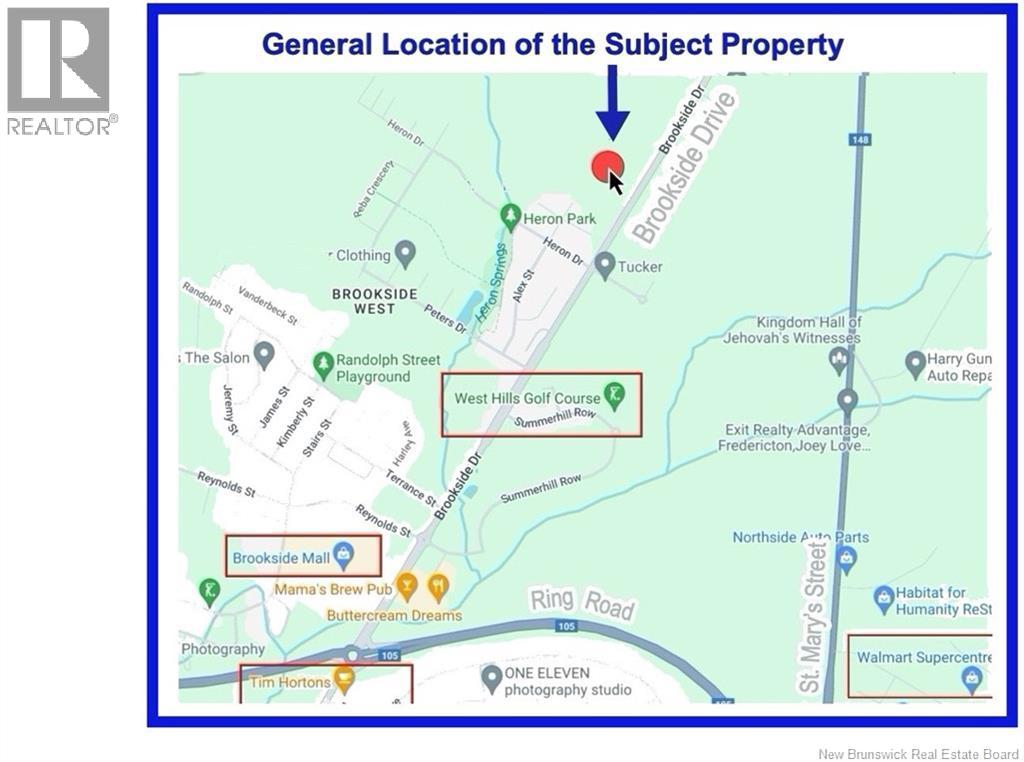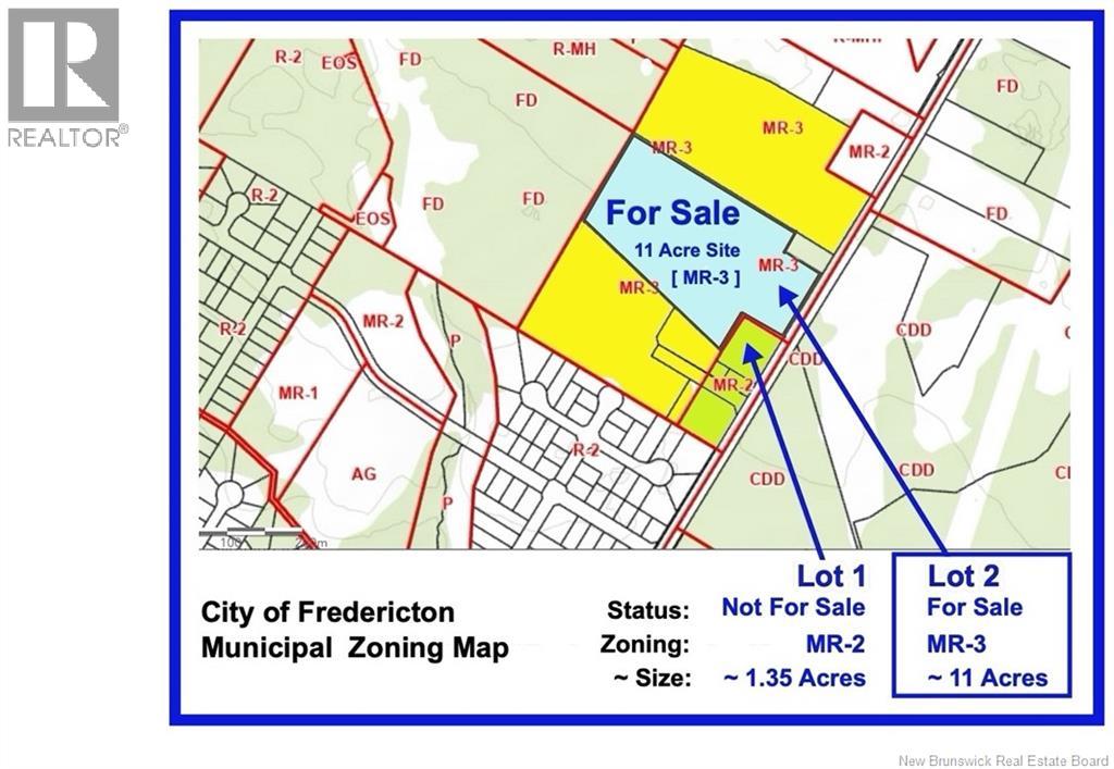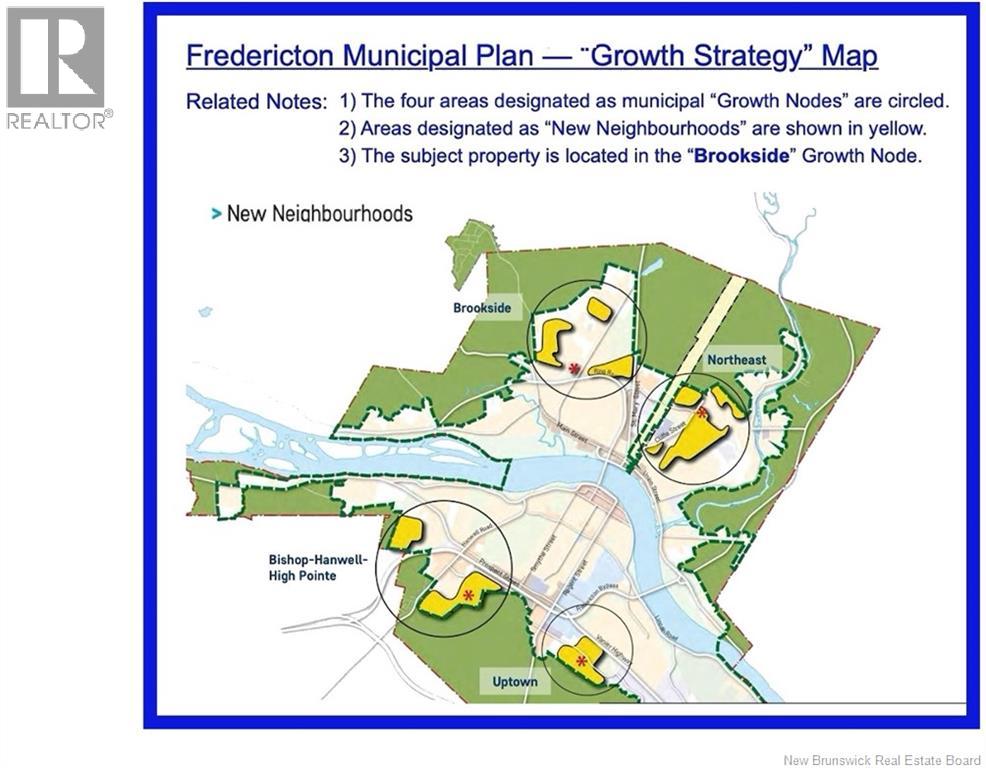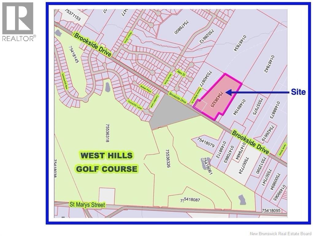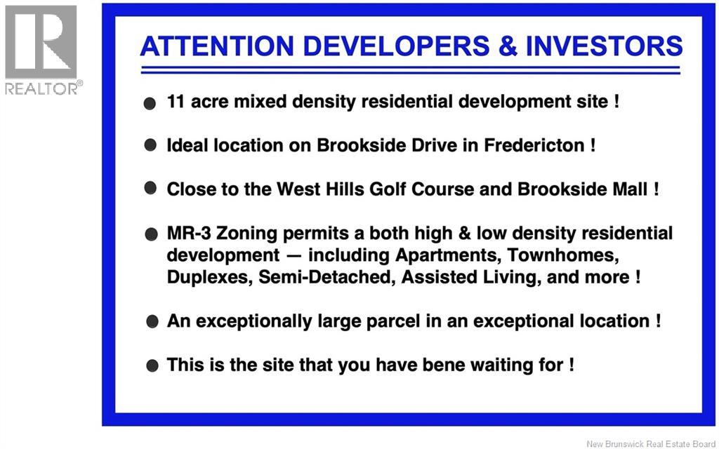 Exceptional residential development / investment opportunity: 11 acres of prime mixed density residential development land on Brookside Drive in Fredericton! . Located close to many key services and amenities -- including the West Hills Golf Course and Brookside Mall (major tenants include: Sobeys, Lawtons, Horizon Health, & SNB). . The MR-3 Zoning classification permits high and low density residential development projects -- including Apartments, Townhomes, Duplexes, Semi-Detached, Assisted Living, and Child Care. . Located in the extremely popular ""Brookside"" neighborhood, which is designated as a key ""Growth Node"" in both the Growth Strategy and Municipal Plan documents published by the City of Fredericton Planning Department. . Note: the Seller plans to survey and subdivide approximately 11 acre parcel from the current 12.35 acre PID# 75438325 prior to closing. Contact your REALTOR® for more information today! (id:34572)