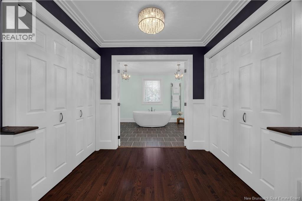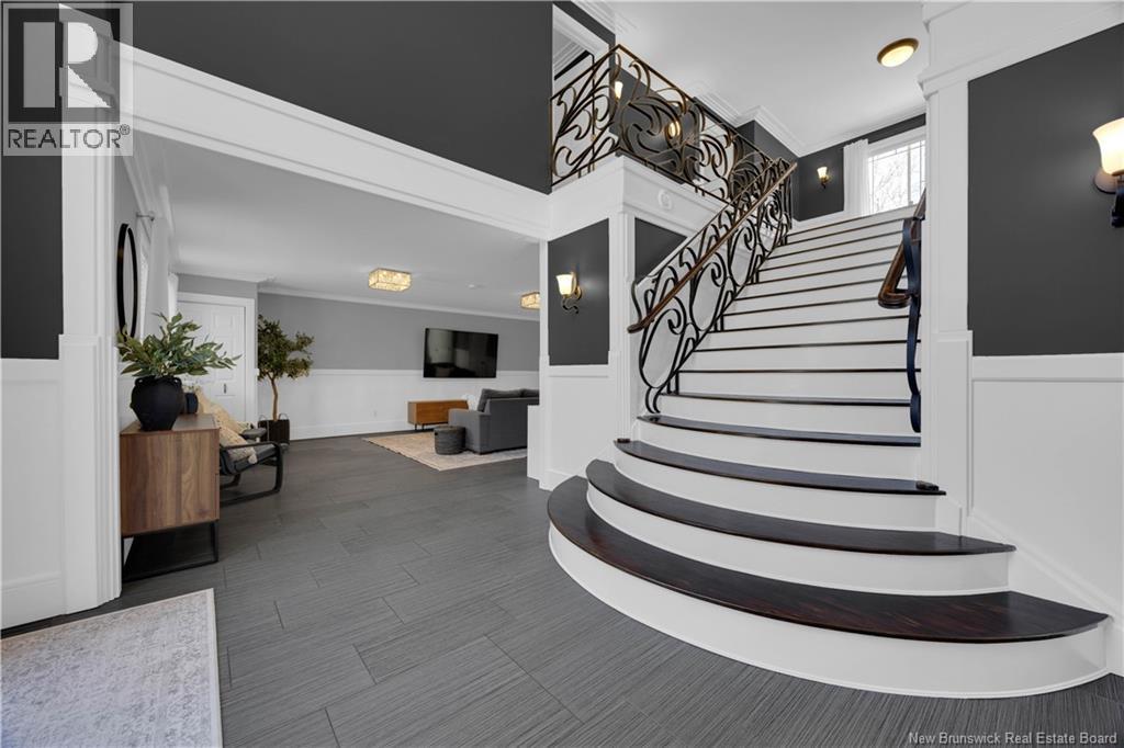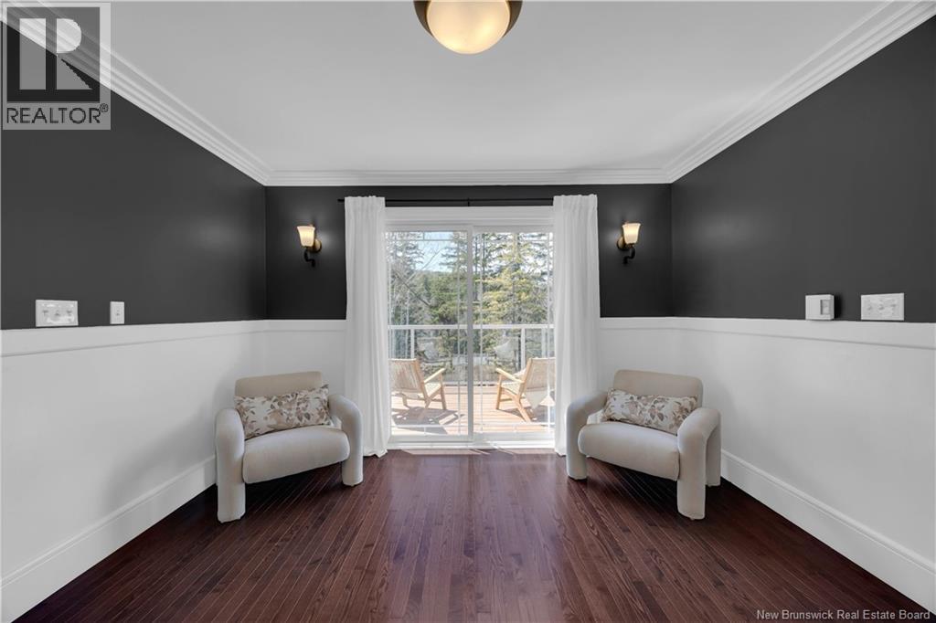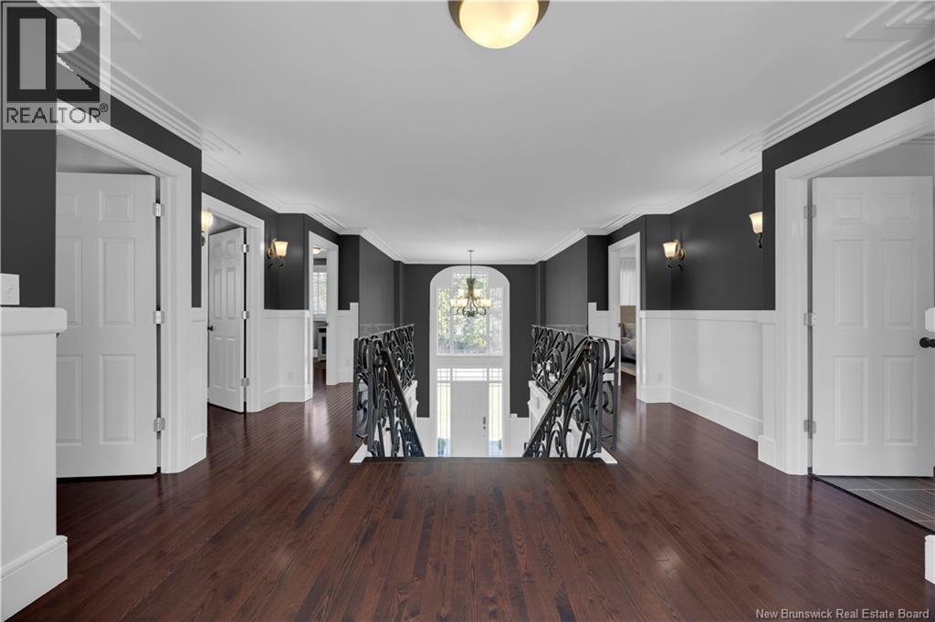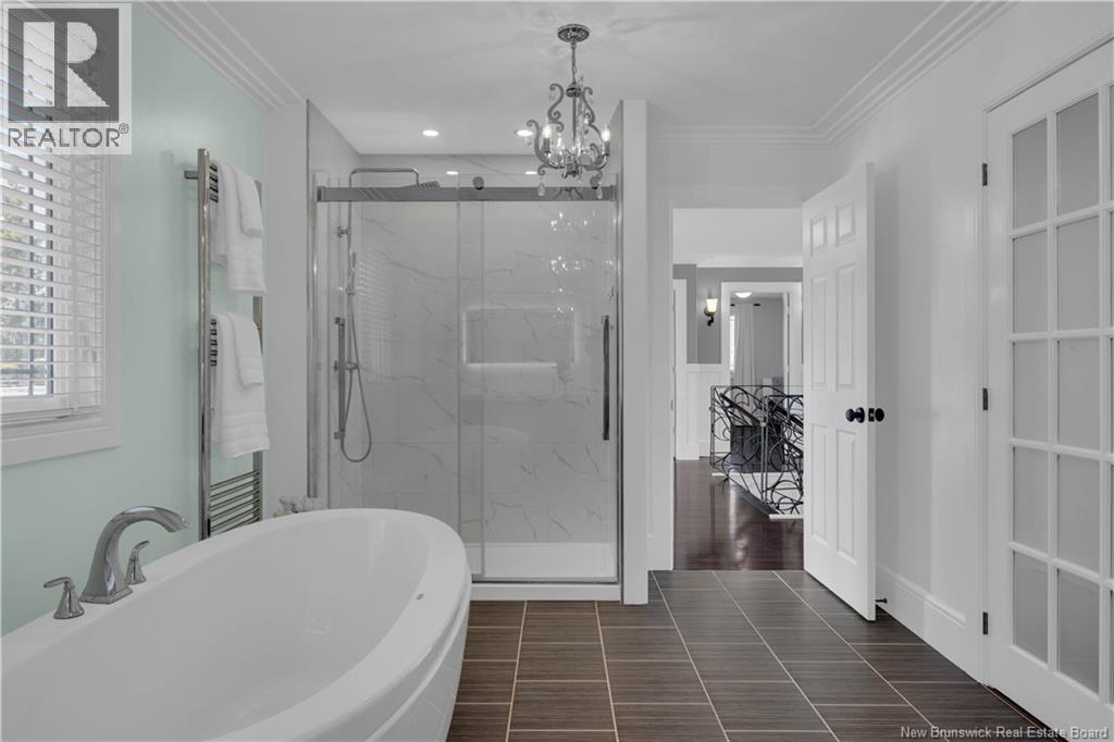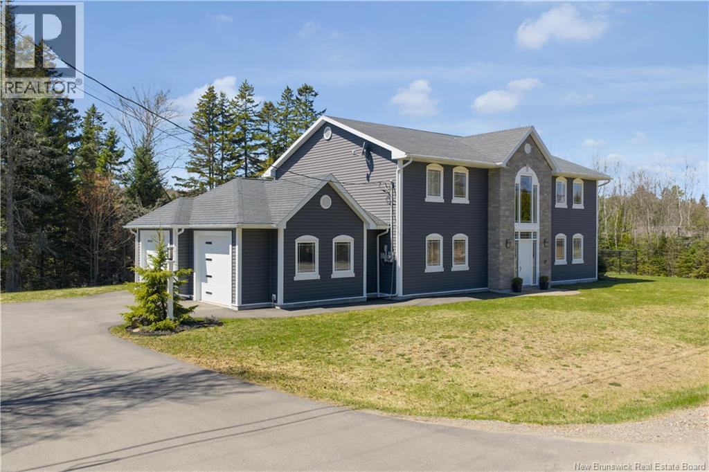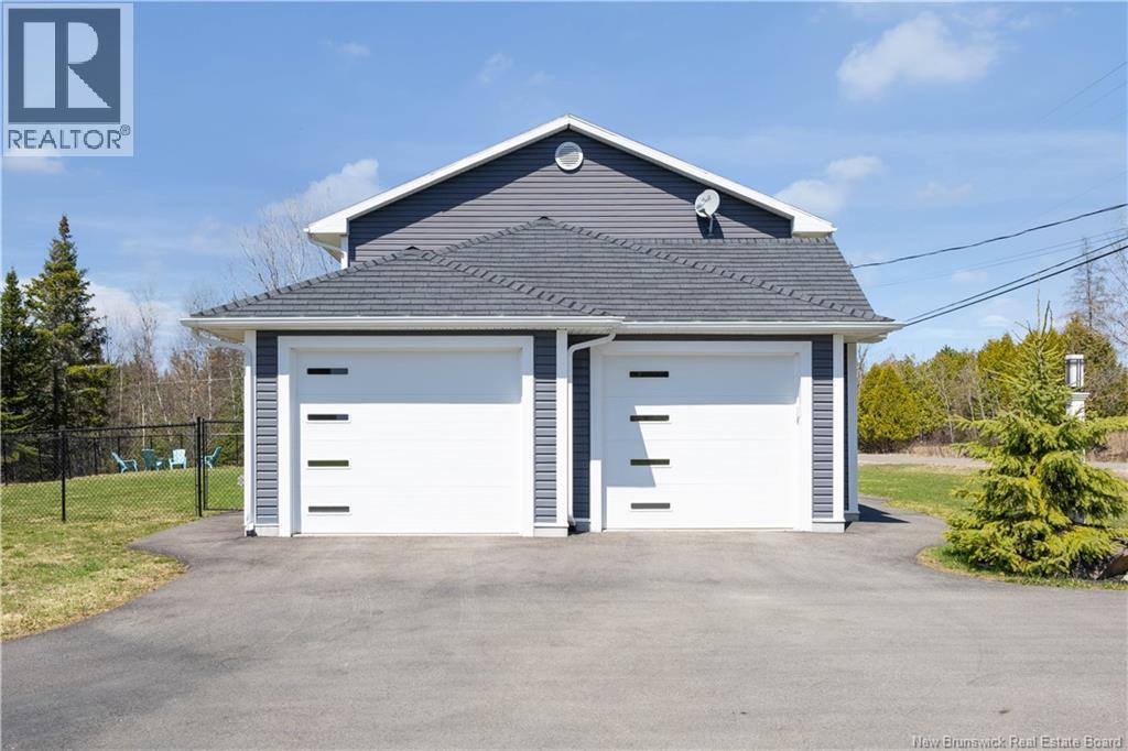 Custom-built contemporary 2-storey home set on a 1.83-acre lot in Hampton, approximately 5 minutes from Kredls Corner Market. Turn-key and well maintained. Front entry opens to a two-storey foyer with a wide staircase and open upper landing. The staircase creates a natural separation between the main living room and the kitchen and dining area while maintaining an open feel. The main floor is laid out for function and flow. The kitchen features full-height cabinetry, quartz countertops, a large central island, glass tile backsplash, stainless steel appliances, and extensive prep and storage space. The adjacent dining area accommodates an oversized table and is positioned for easy use when hosting. A full main floor bathroom includes integrated laundry and additional storage. The rear entry is set up as a mudroom, providing a practical transition space for day-to-day use. Heated tile flooring runs throughout the main level. Interior finishes include hardwood flooring on the second level, along with crown moulding and wainscoting carried consistently throughout. Second floor includes 4 bedrooms. The upper landing overlooks the foyer below and provides separation between the primary and secondary bedrooms. The main bathroom is finished with a freestanding soaker tub, glass walk-in shower, and double vanity. Attached double garage is fully finished with built-in storage and prepped for in-floor heat. Exterior includes a paved driveway with turnaround, fenced yard, 16x10 storage shed, covered patio, and a second-level deck with glass railing. The property is bordered by mature trees with a brook running along the rear of the lot. (id:34572)