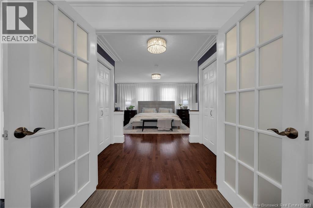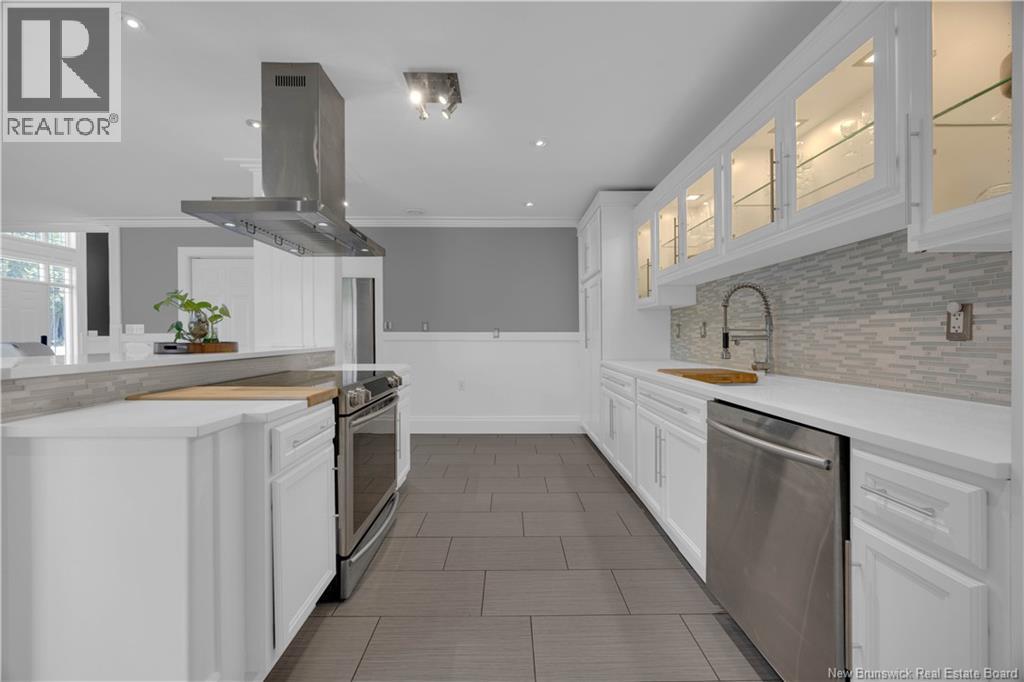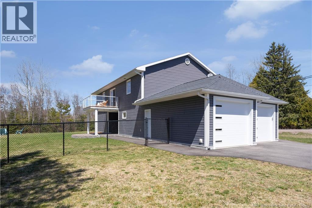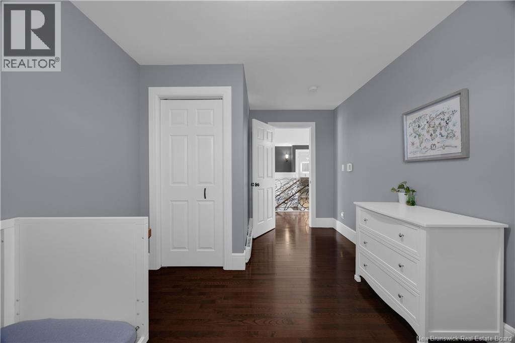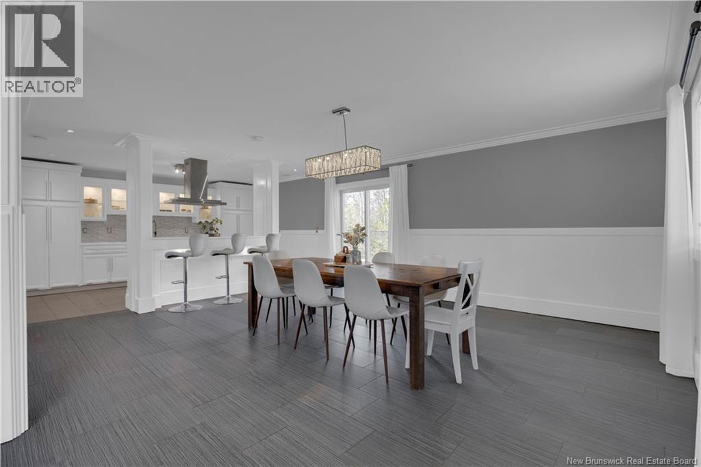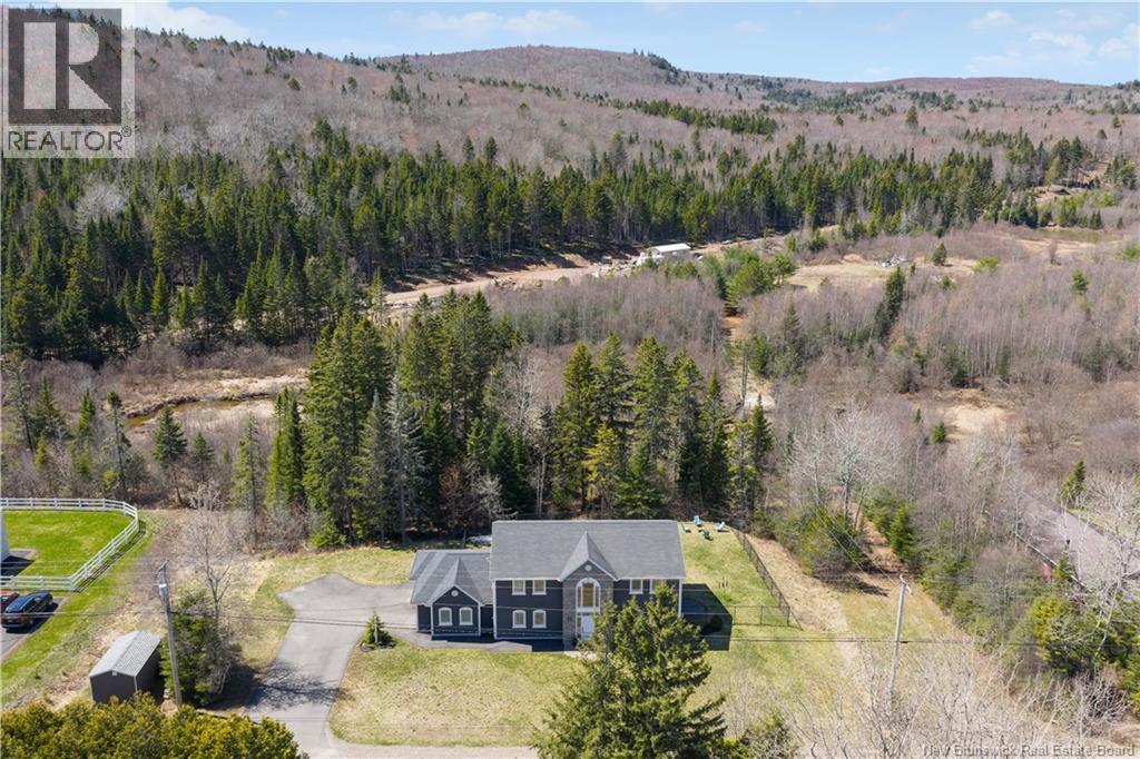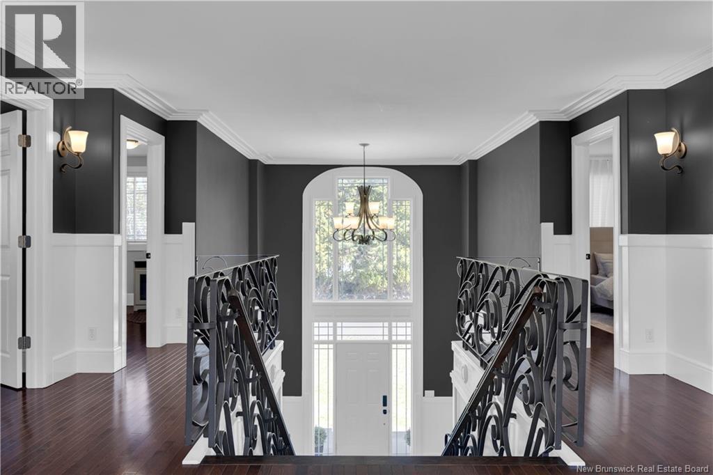 Custom-built contemporary 2-storey home set on a 1.83-acre lot in Hampton, approximately 5 minutes from Kredls Corner Market. Turn-key and well maintained. Front entry opens to a two-storey foyer with a wide staircase and open upper landing. The staircase creates a natural separation between the main living room and the kitchen and dining area while maintaining an open feel. The main floor is laid out for function and flow. The kitchen features full-height cabinetry, quartz countertops, a large central island, glass tile backsplash, stainless steel appliances, and extensive prep and storage space. The adjacent dining area accommodates an oversized table and is positioned for easy use when hosting. A full main floor bathroom includes integrated laundry and additional storage. The rear entry is set up as a mudroom, providing a practical transition space for day-to-day use. Heated tile flooring runs throughout the main level. Interior finishes include hardwood flooring on the second level, along with crown moulding and wainscoting carried consistently throughout. Second floor includes 4 bedrooms. The upper landing overlooks the foyer below and provides separation between the primary and secondary bedrooms. The main bathroom is finished with a freestanding soaker tub, glass walk-in shower, and double vanity. Attached double garage is fully finished with built-in storage and prepped for in-floor heat. Exterior includes a paved driveway with turnaround, fenced yard, 16x10 storage shed, covered patio, and a second-level deck with glass railing. The property is bordered by mature trees with a brook running along the rear of the lot. (id:34572)